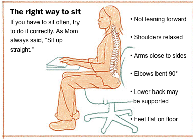 - Another thing to focus on while sitting is to make sure your feet rest flat on the floor, with your knees and hips bent 90 degrees. Your elbows should also bend at 90 degrees while typing or resting on the arm rests of your chair. If your knees, hips, and elbows aren’t bent correctly, adjust your chair until they are.