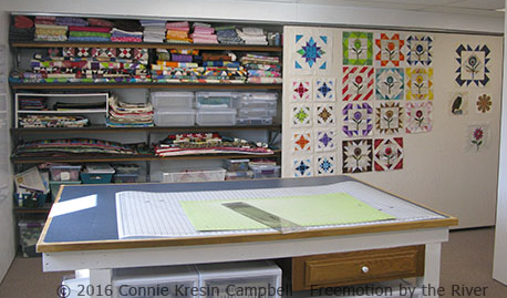 Design walls are a must for any quilter. What's a design wall? It is a vertical wall that allows you to shift about and preview quilt blocks, compare fabrics, and determine a design layout. Covered in either flannel or batting, the design wall's slightly fuzzy surface allows pieces of fabric to stay in position as you move them about without using pins. By stepping away from a design wall, you are better able to judge a quilt's overall appearance as it is much easier to determine areas that might need tweaking.