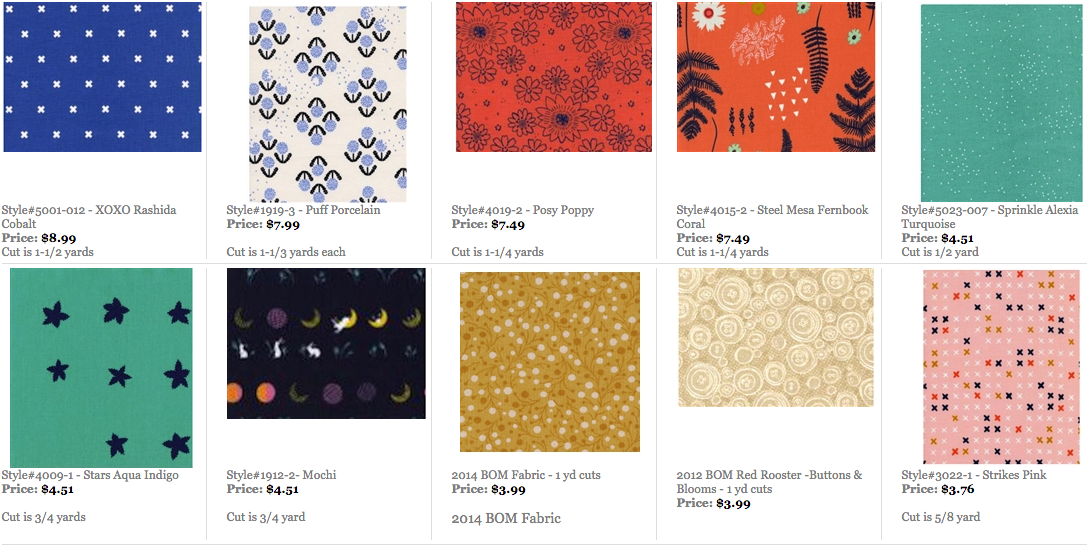 As we wait to unveil Sue Garman's Block of the Month for 2017, we have a little of the Cotton and Steel Fabrics left over and some pieces from past BOMs. These fabrics are gorgeous and will fill in those colors you have been looking for. Priced at $5.99/yd or $3.99/yd these fabrics cover the spectrum of color. Alex says you can never have enough white. How much orange do you have? Or Pink? Take a look at what is on Sale and remember when it's gone, it's gone. The pieces are precut in certain sizes so the prices reflect the number of yards it is sold in.
