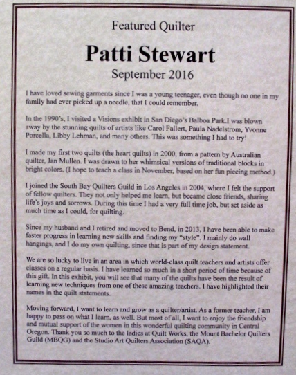 As a person who writes about quilting and quilters, my travels allow me to cross paths with many who cut up fabric and sew it back together. With my home base landlocked by mountain passes in a rural area of Oregon, you would think there would be a limited number of crazy people who cut up fabric and five quilters I haven't met. There are so many quilters in Central Oregon that QuiltWorks in Bend has a monthly gallery show featuring mostly local quilters. The September Featured Quilter is Patti Stewart, whose work is new to me. I loved this show because she does it all...as you enjoy the slide show you'll understand what I mean. Patti doesn't just piece, embroider or appliqué...she is not just a traditionalist or a modern quilter...she seems to enjoy it all!! Such an inspiration!
