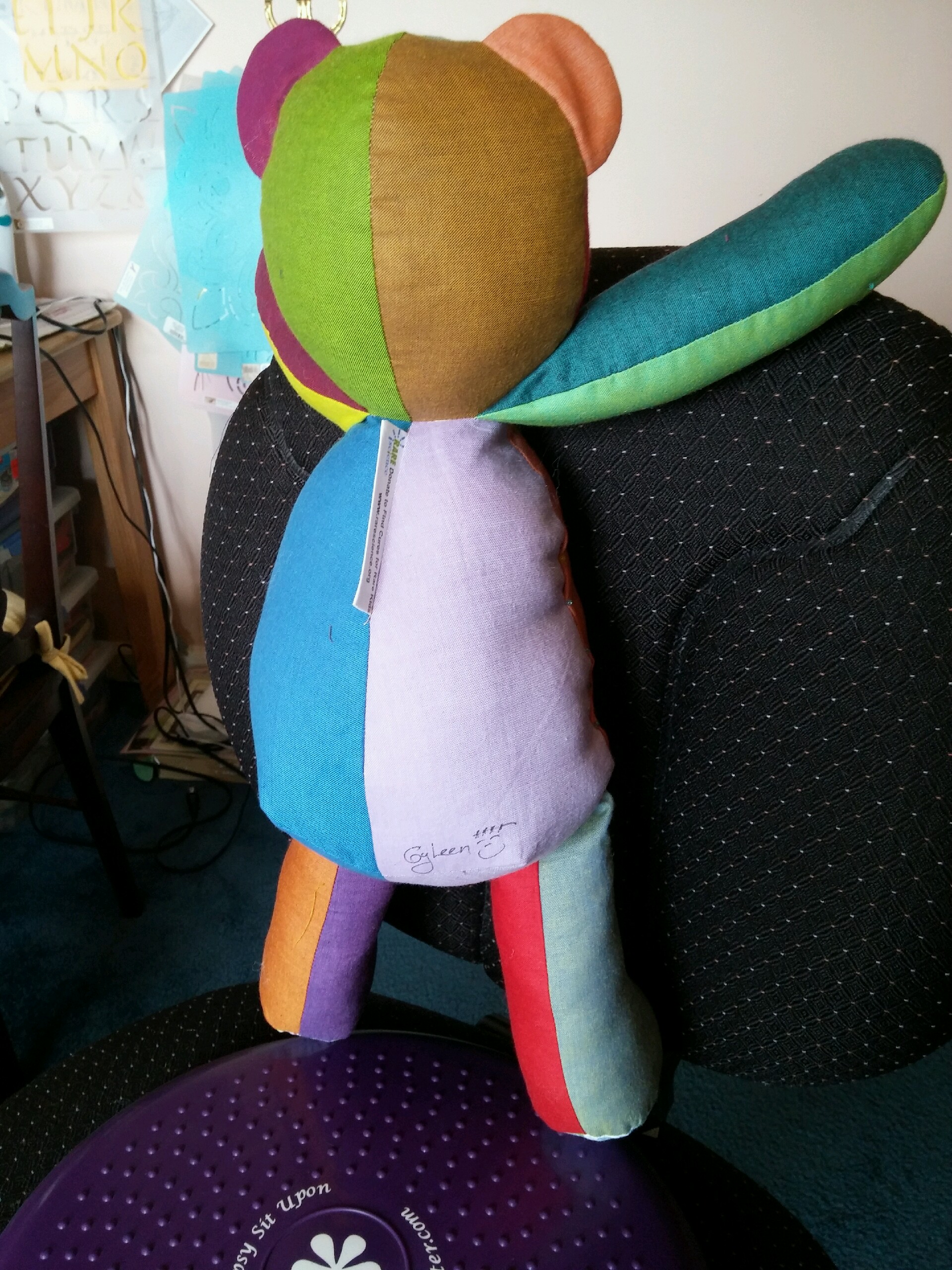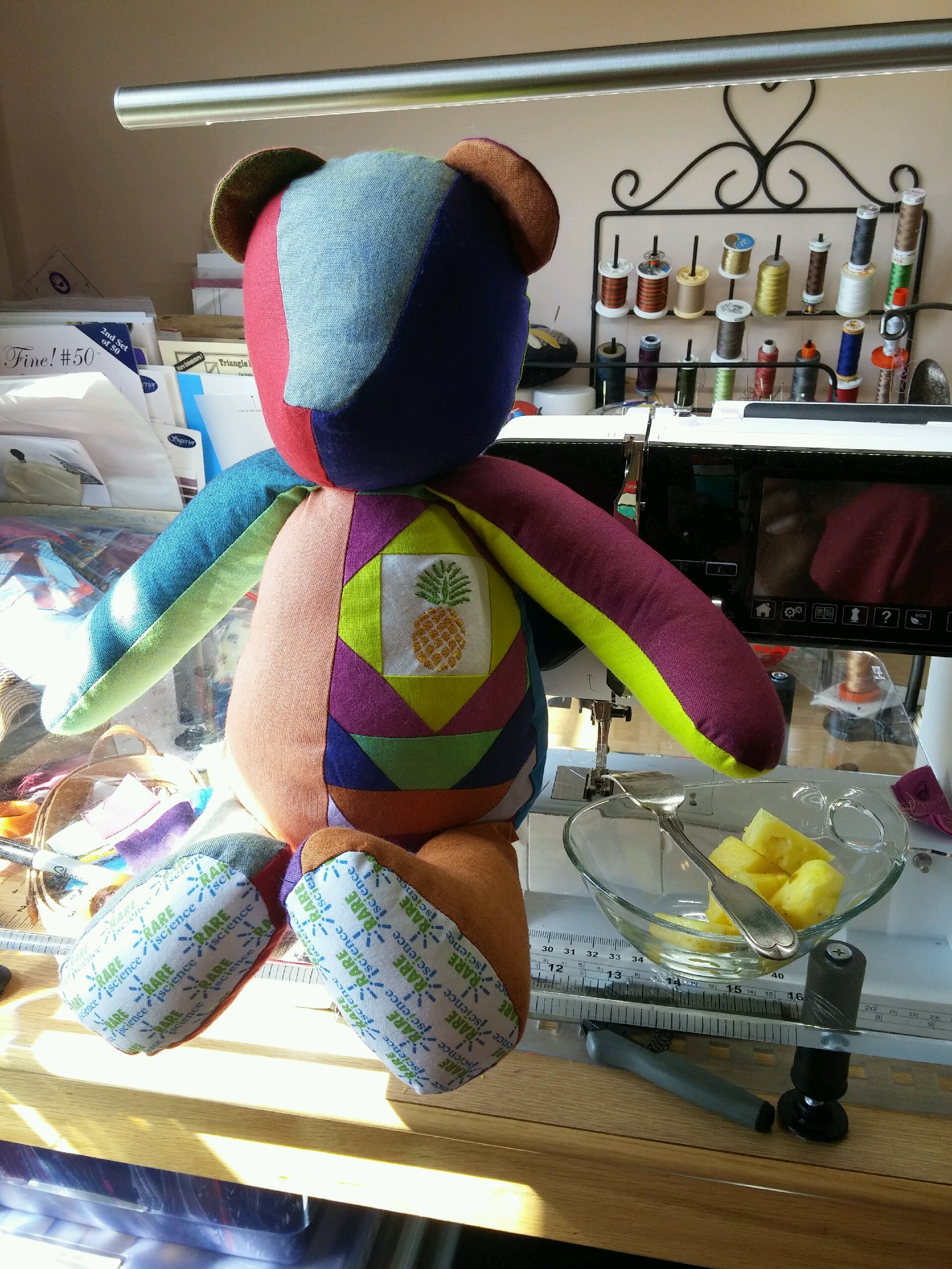 "When asked to make a RARE Science Bear that represented me as a quilt artist, I knew it had to be a pineapple bear. Since the launch of Pineapple Tool by Gyleen in 2005, I’ve been known for making and teaching Trash to Treasure Pineapple Quilts. True to the pineapple concept I upcycled the materials. The embroidered pineapple on the center square was cut from a linen bread cloth. I used Peppered Shot Cottons strips and leftovers to complete the pineapple block and to color block my bear. The ribbon was from a lovely gift I received last year. I wanted to infuse as much color and playfulness into the bear as possible. Mr. Pineapple makes me smile. You’re going to love him, bid high."