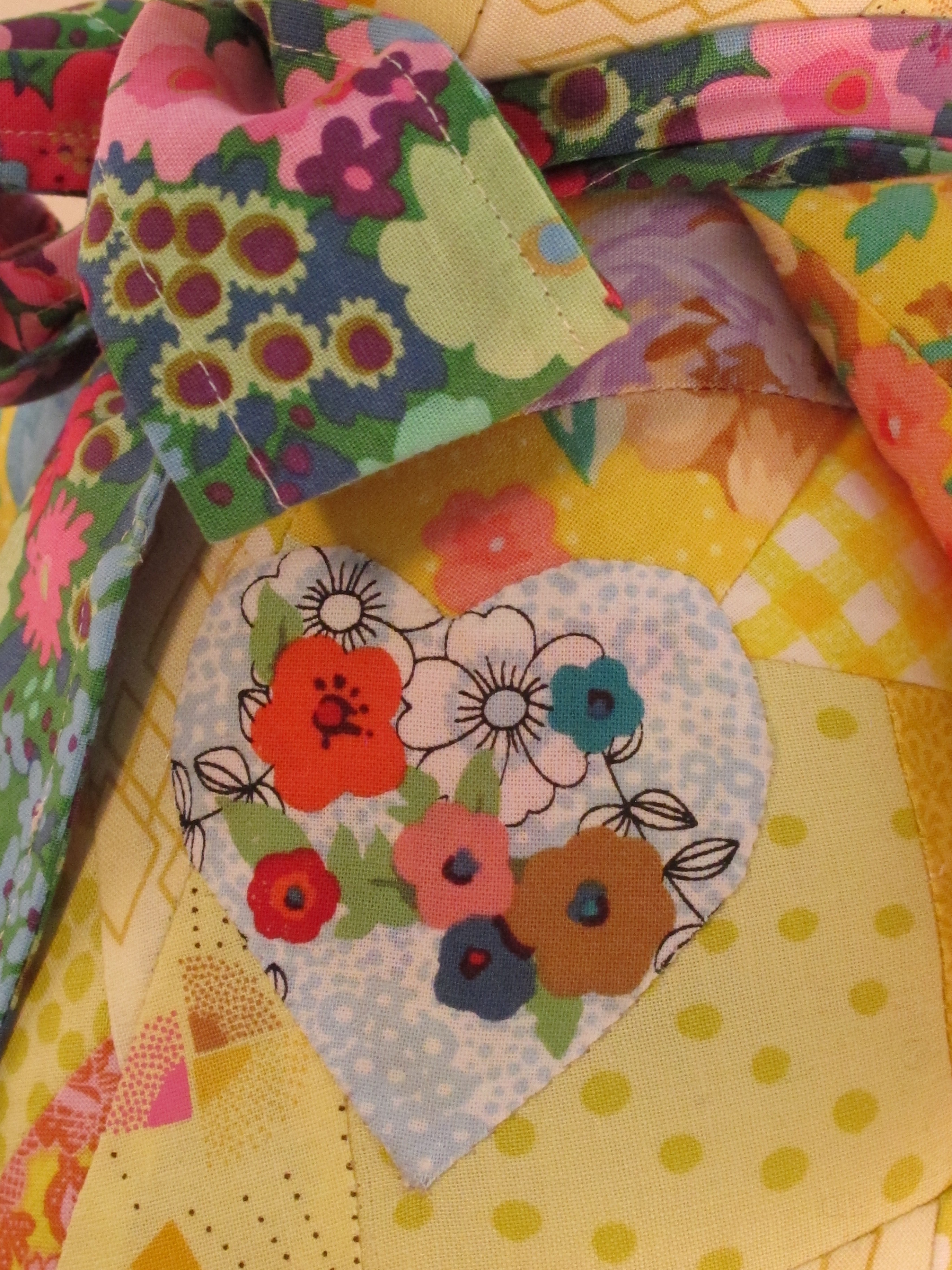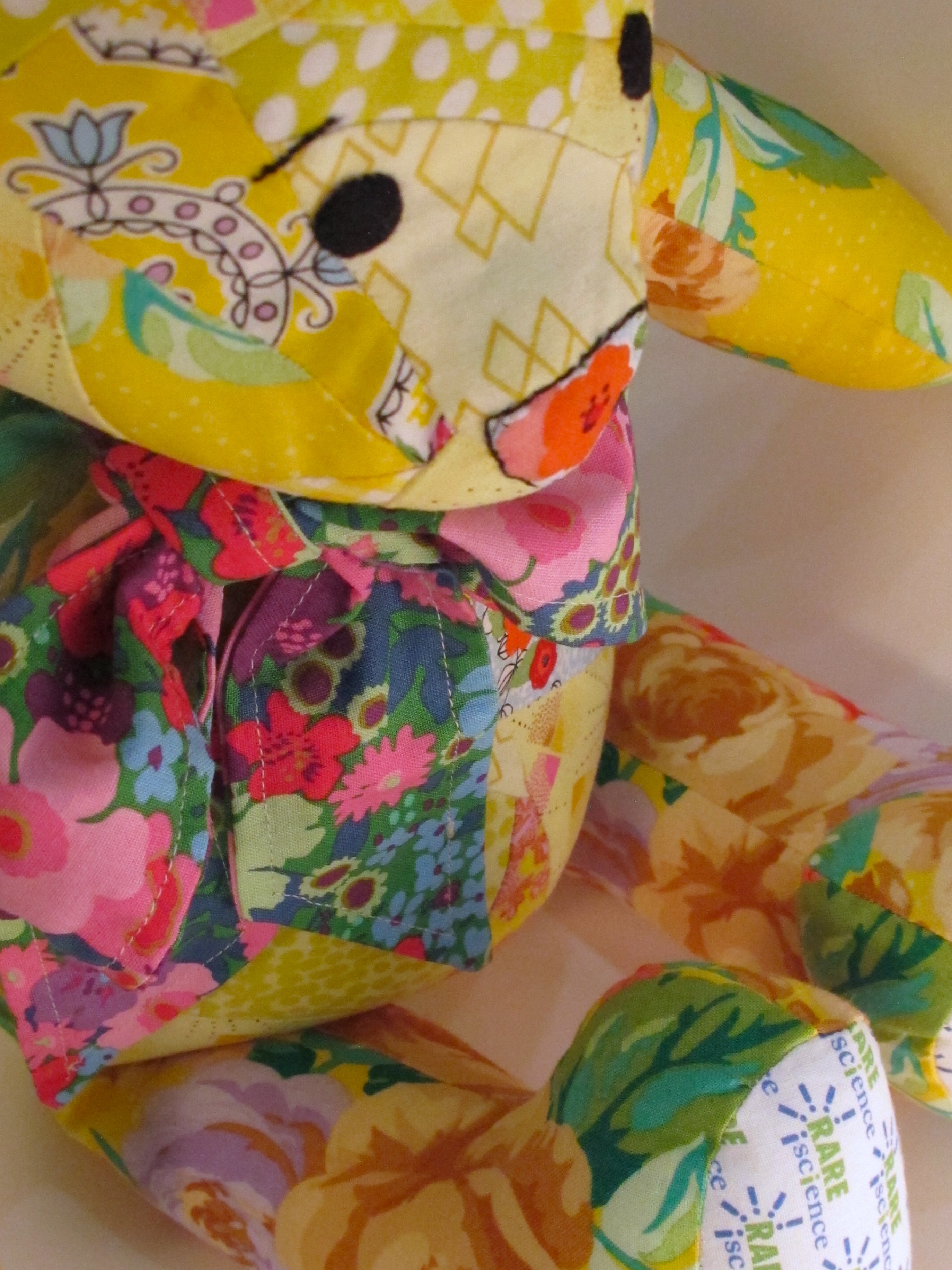 "Thinking about how my daughter's childhood lovey-toy when she was young, and how it has been repaired many times. Considering that I sew my scraps together to make something that you can love and snuggle, it seemed appropriate to make a bear from my favorite yellow scraps. I love the homemade quality, because when I was a kid, my mother always asked for home made gifts, not store bought. I love that you can tell that it was made by my hands, and pieced with love."