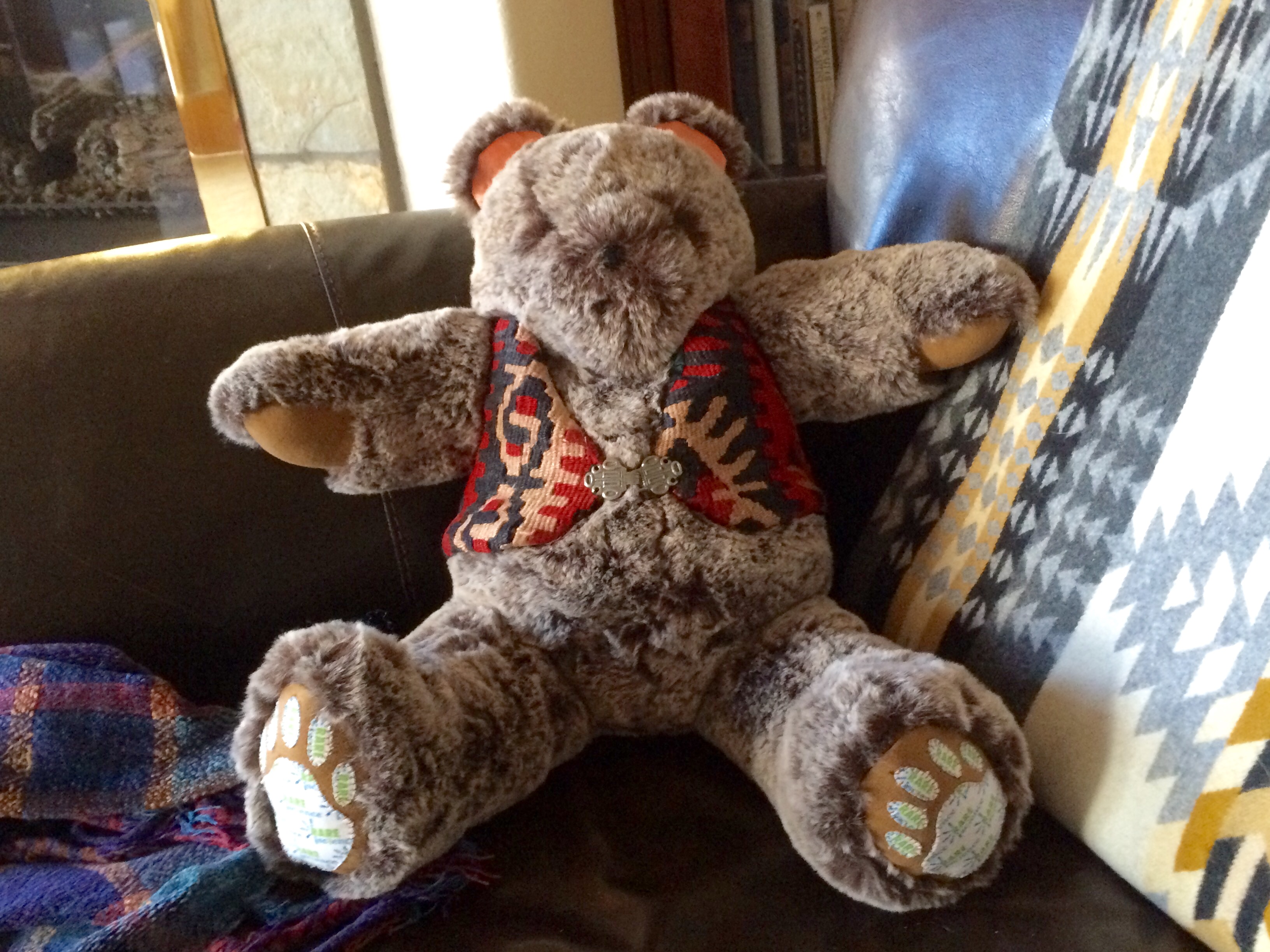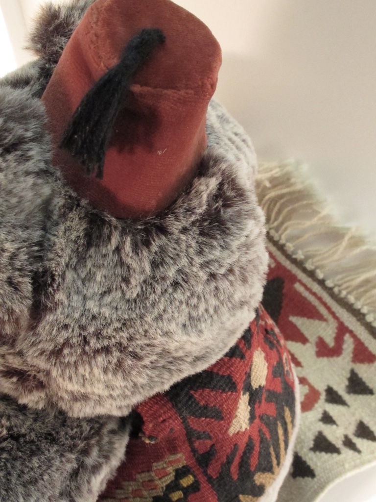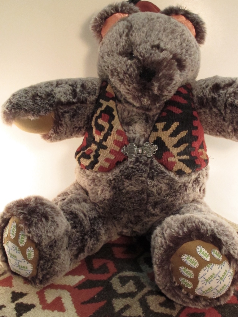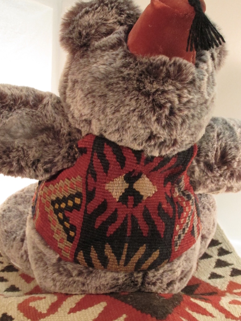 Artist Lea McComas has traveled the world exploring and collecting handmade textiles and researching techniques for surface design. Some of her greatest experiences occurred while living in Turkey. When asked to make a Rare Bear, she reached into her “very special” textile stash and found inspiration for Ali Bear-Ba in the pieces of antique kilim that were used to make his vest. His “Magic Carpet” is a hand woven mat acquired while living in the remote Turkish village of Karatepe, where Lea studied local weaving techniques.