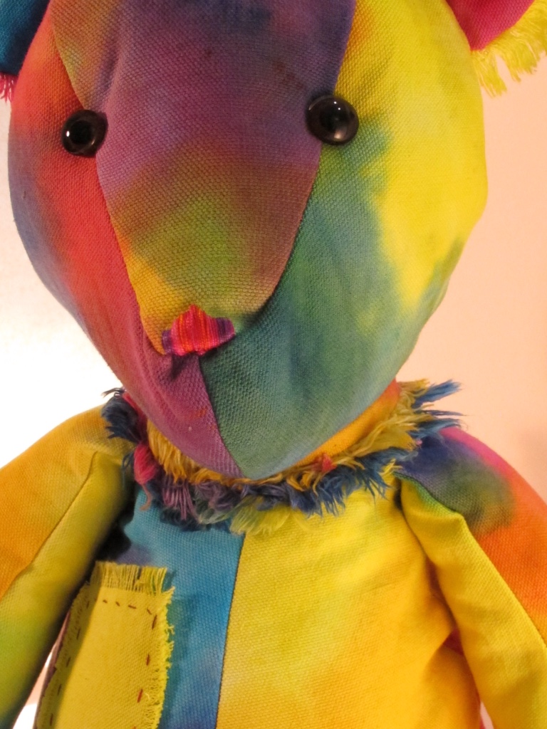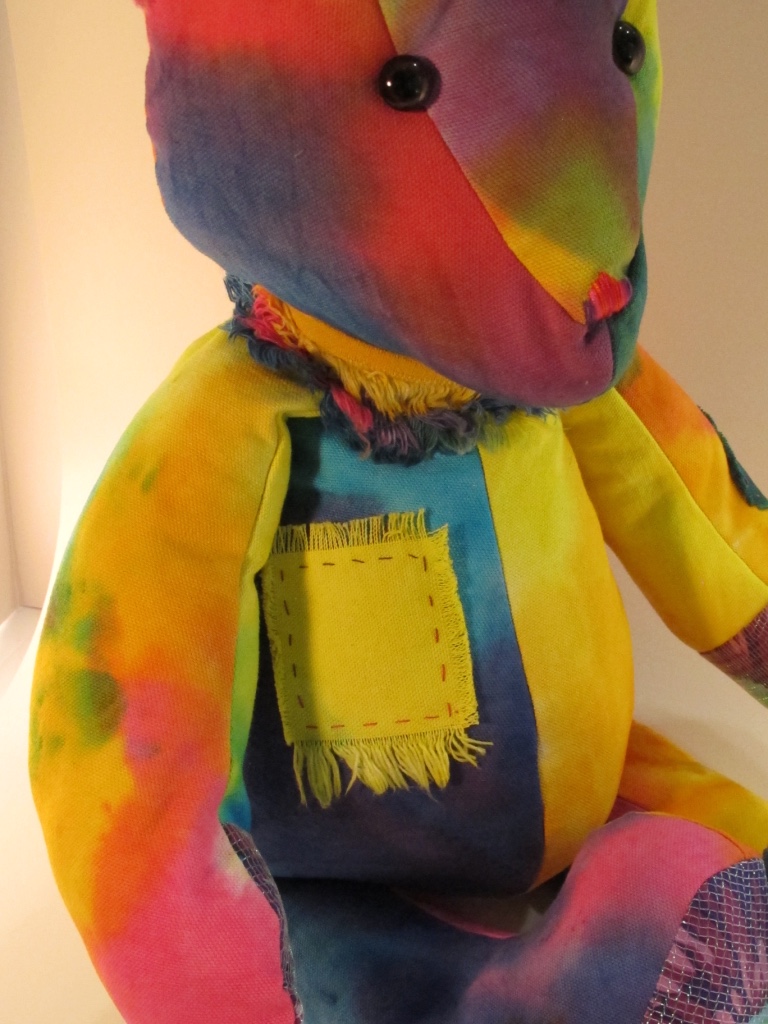 Recently, lured by the scent of something that smelled appealing, the bear apparently made his way into Ricky’s dye studio and accidentally fell into a large dye filled pot. As it was very late in the evening and raining heavily, no one happened to be in the studio to hear the disturbance. The next day as Ricky and Justin arrived, they found large muddy footprints leading from a back window (which had accidentally been left open) to the dye studio. Upon entering the studio, they discovered a very hungry and distressed bear wedged inside the dye pot and unable to get out. He was covered in a rainbow of colors and had several major injuries to his arms and legs. Everyone knows that Ricky and Justin have a soft spot for animals in need. So Ricky, who just happens to be a wiz at hand sewing, stitched up the cuts and added a few patches to larger areas where the fur had been torn away, while Justin found something to eat in the kitchen to calm the bear down. Once he had been fed and patched up, the bear scampered off out of town. No one has seen him since, but there were a few rainbow colored hairs found at a picnic area just outside of town.