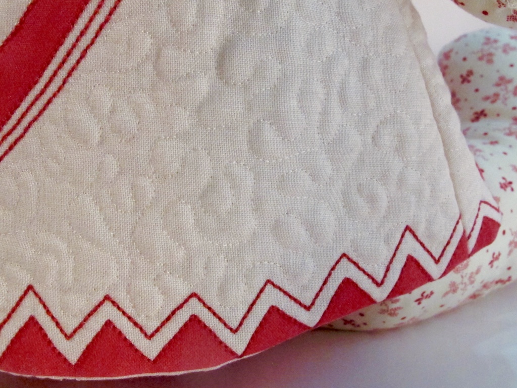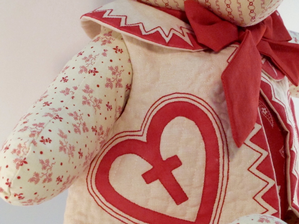 Her vest, featuring the Cross Your Heart emblem (that she hand-painted using a stencil and Paintstiks), shows that this upcoming event means a great deal to her. The small red triangles, outlined in Redwork, along the collar enhance her creamy white complexion, while the bow under her chin will hide the nervousness she feels when she meets the "next man of her dreams."
