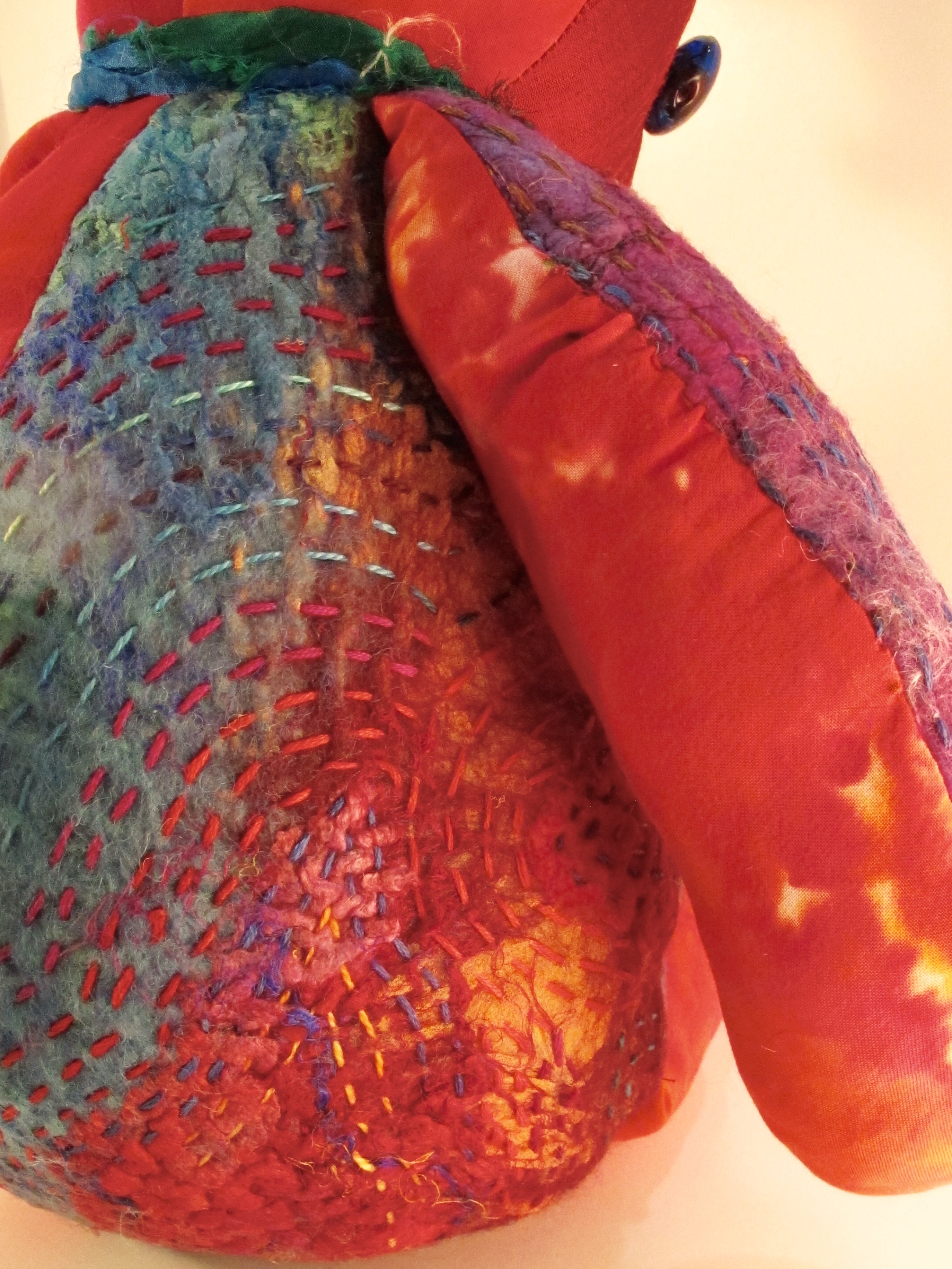 Ruby Duby is made with a combination of luscious hand-dyed Dupioni silk and silk fusion. Hand embroidery and beautiful set of fused glass eyes and ribbons of silk sari fabric around her neck complete the ensemble.