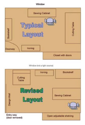 The core work elements of most any quilt studio are sewing, pressing, and cutting. And as such, they should work together in harmony. Movement from one area to another should ideally be done in what is called a 'work triangle.' The concept comes from the kitchen design world. For the most efficient work, the refrigerator, stove and sink are placed in a triangular arrangement (with each area having its own dedicated tools and supplies). This avoids the necessity of walking miles between tasks. Design also factors into this equation, but as design is ideally done vertically, it won't take up your prime floor space.