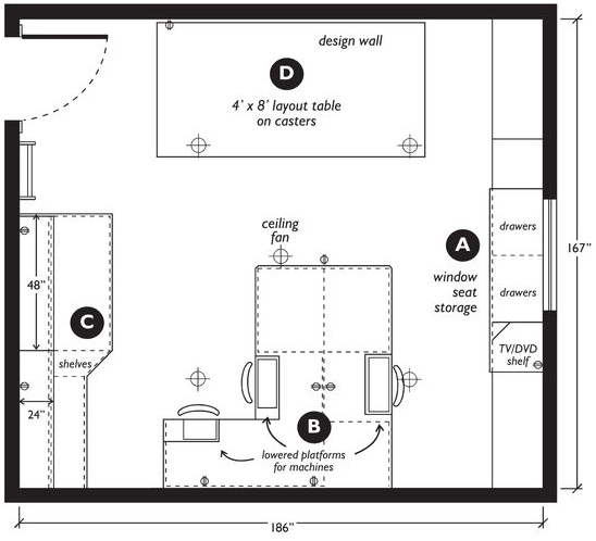 Using your drawn room layout with noted light sources and paper “furniture,” try different arrangements, keeping the most-used items within easy reach and allowing enough room to move around your space in comfort. You’ll quickly realize which layout works best for you. Quiltviews