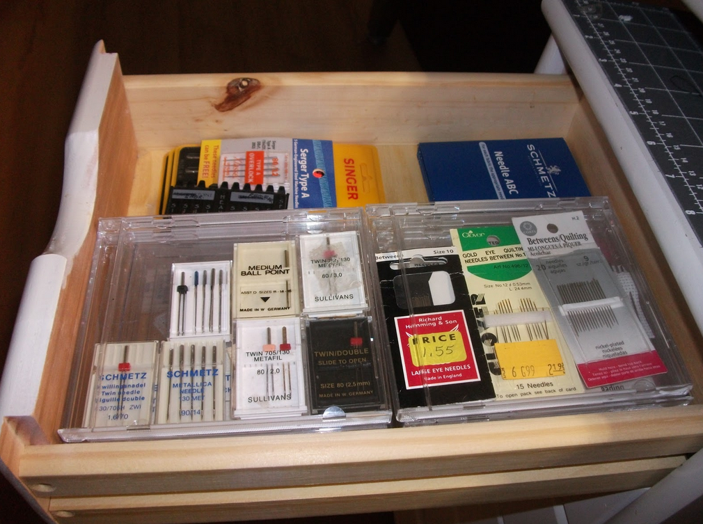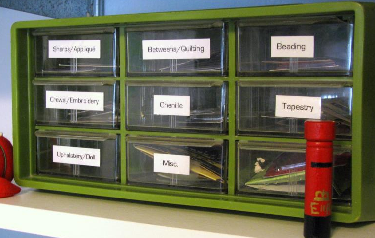 Plastic multi-drawer unit to hold various hand work needles. Feeddog