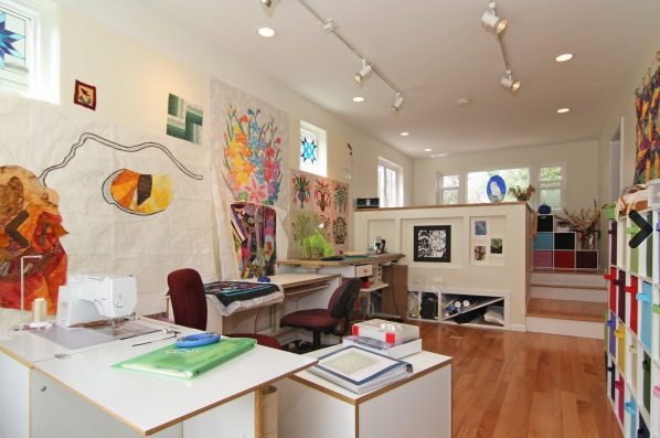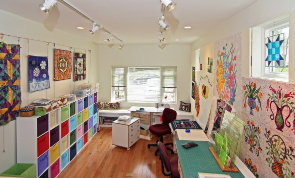 Many a quilter dreams of having a dedicated studio space. Often reality does not allow such dreams, while children, work and other obligations take precedence. When the time and budget does allow for a personal studio space, there might be a number of things to consider that just may not have been on your radar. This is the second of four studio visits wherein we present obstacles, ideas, and tips from fellow quilters who have generously shared their studio designs from an idea to a finalized space.
