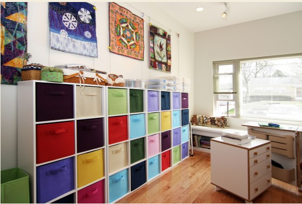 Suzanne - The canvas drawers and shelving are from Closetmaid and you can get them at Target. I store all of my fabric in them - somewhat by color