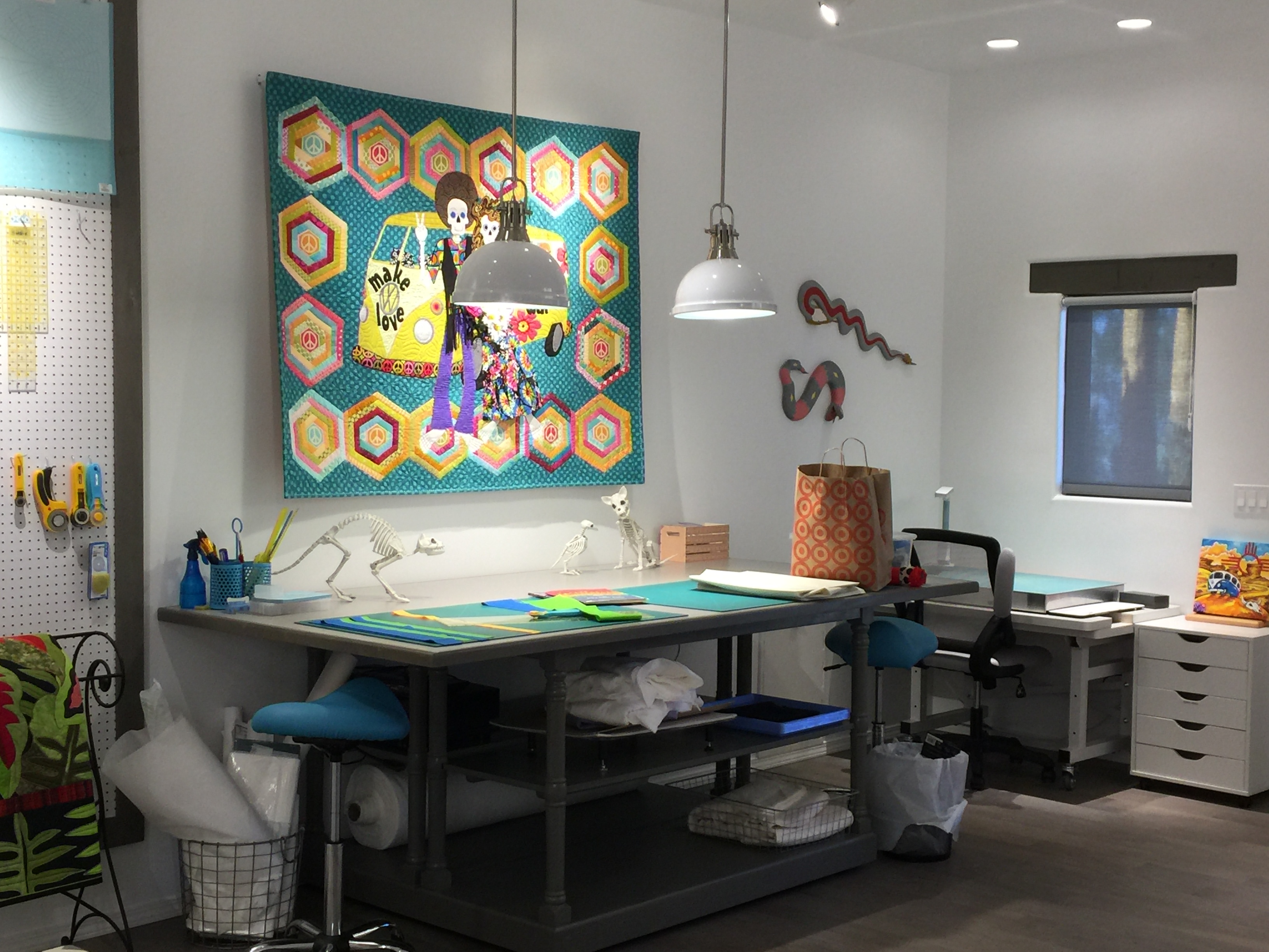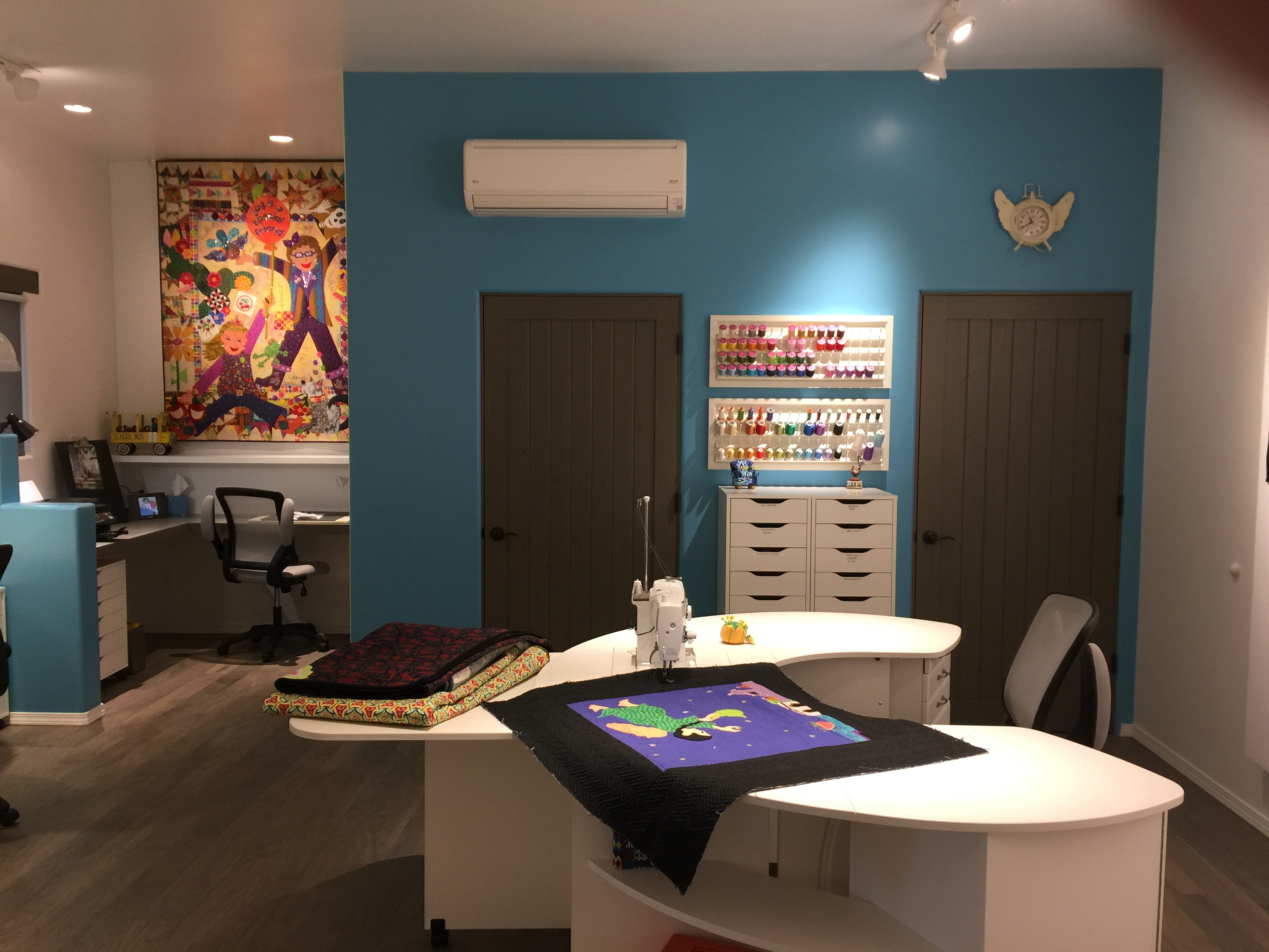 The studio is a calm and serene space where I can retreat to work for hours at a time. As it is only a few steps from the house, for me, it is like entering a whole other world. Keeping a calm and serene design esthetic was instrumental in the choice of decorations and quilts that occupy the space. I feel very blessed to have a space such as this.