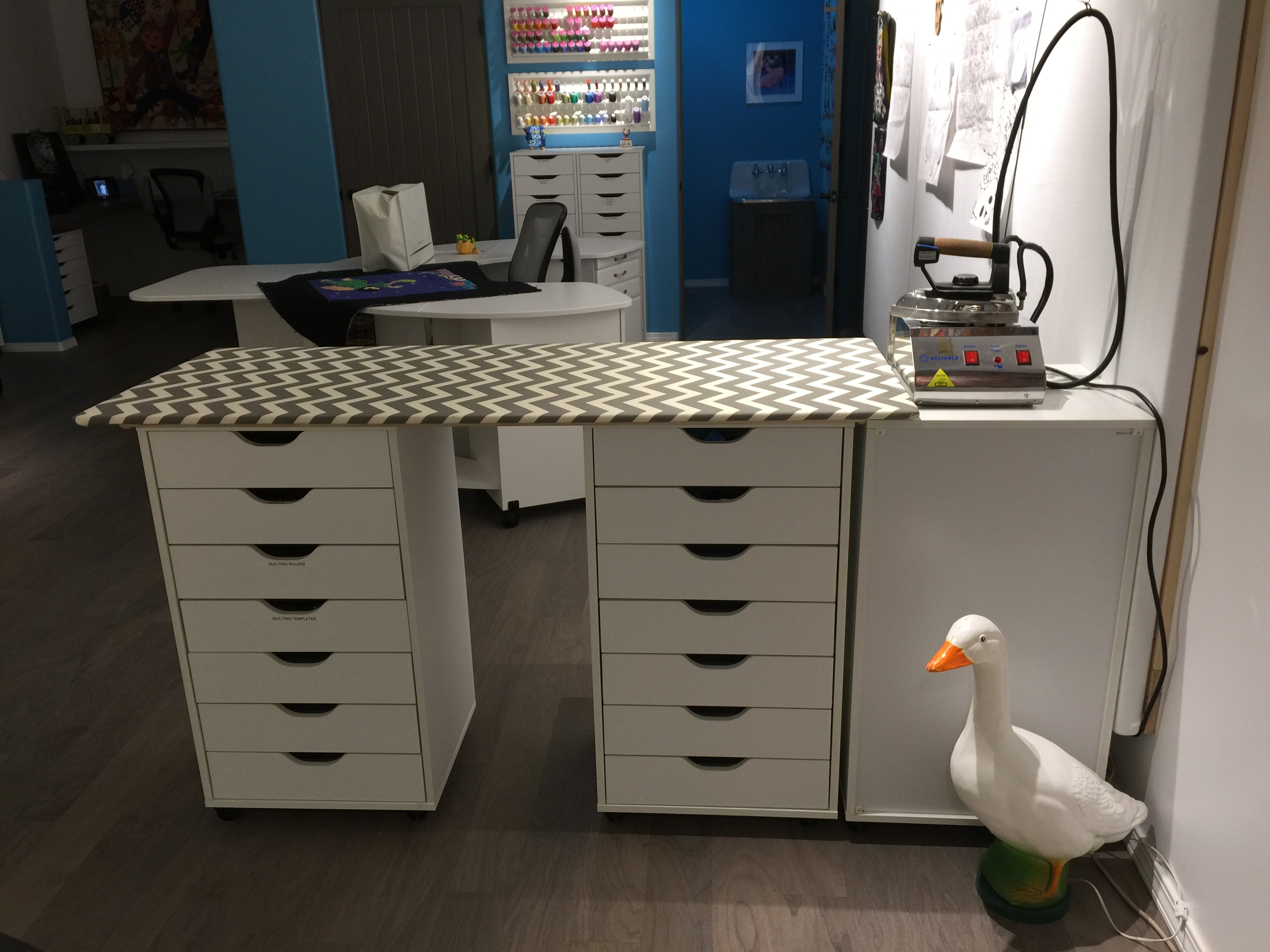 It was an absolute luxury to have a project that I could build from start to finish. Over the course of my quilting years, I have worked in a variety of spaces that were very small or guest bedrooms. This new space was something that I could design myself for the things that were important to me as an artist. As I prefer to work in a calm and minimalist space, my desires were for a clean looking and easy to clean space. While working, I prefer to have three machines out, a large ironing space, a large design wall, a cutting table, and good lighting. "Think Dr. office," I told the builder, "I want it to look clean and clinical."