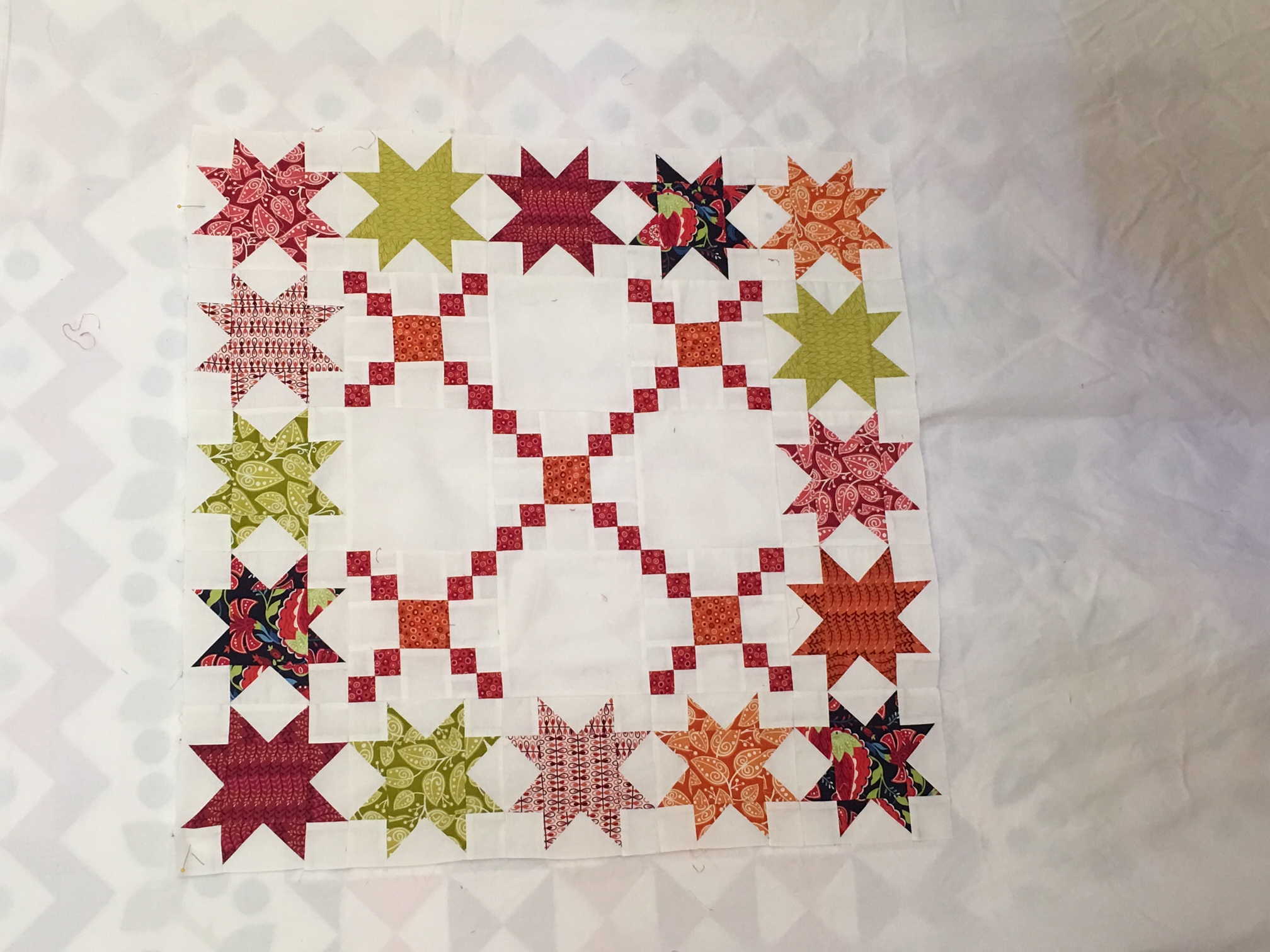 Also at market, my new line with RJR Fabrics, Mirage, will debut (booth #1034). I am super excited about the vibrancy of the colors and to showcase them, I have been sewing like a mad woman. Many of the projects have been posted on my Facebook page. With a week or so to go, the last quilt is shaping up.