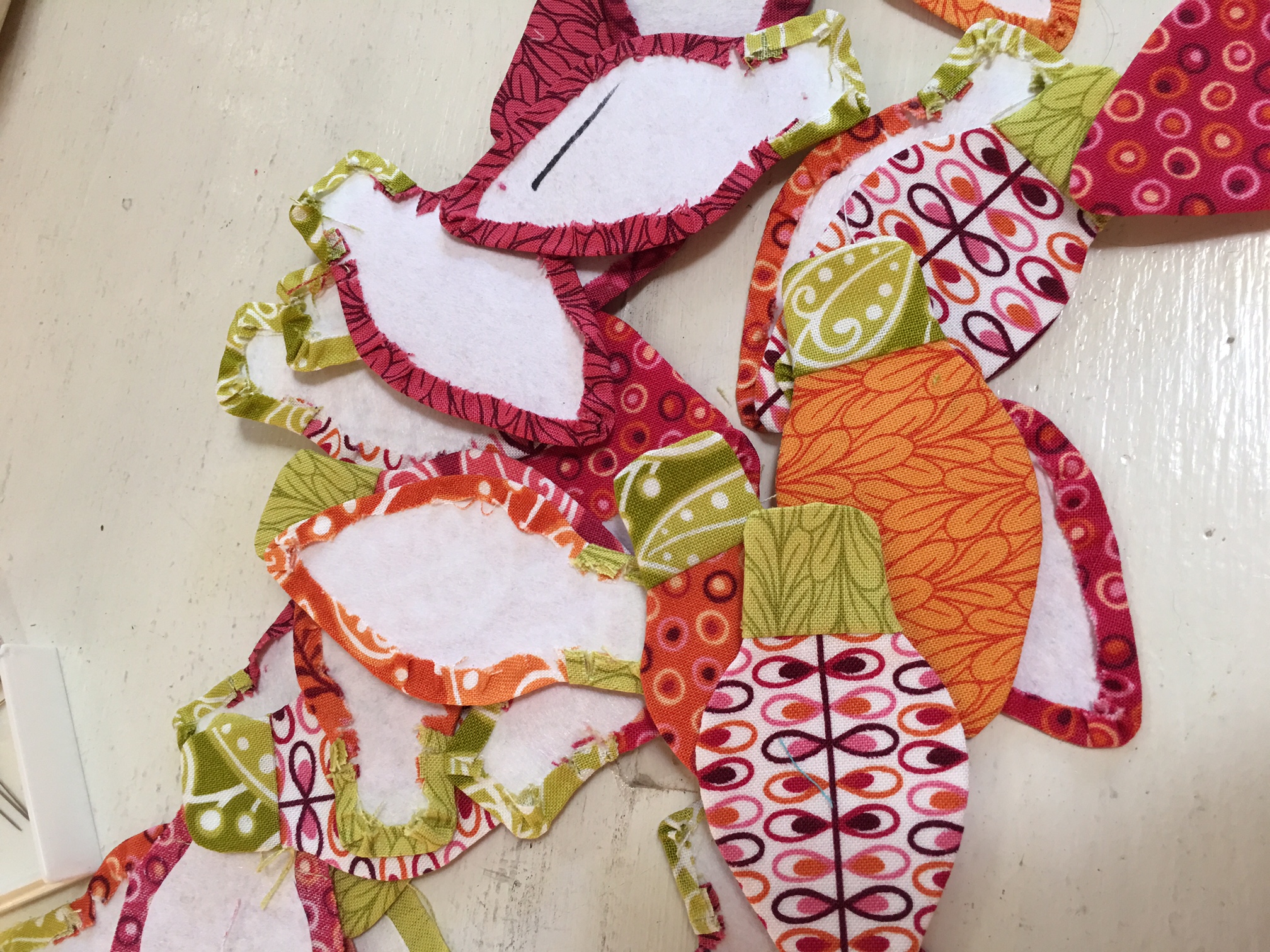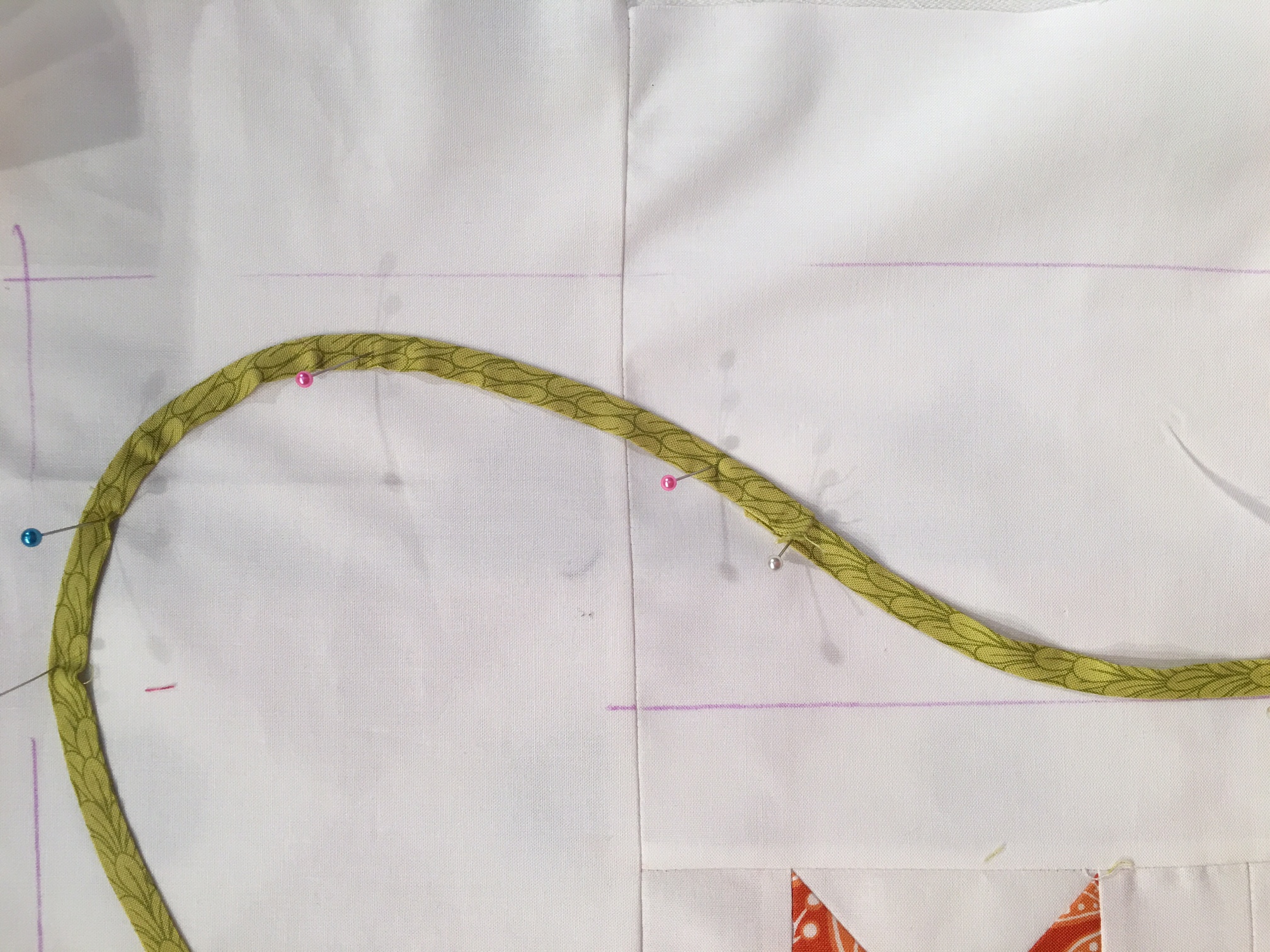 I really liked where it was heading but felt an appliqué border would seal the deal. Note to self: my design wall was already occupied! Making sure that everything was secure on project #1, I simply pinned a white table cloth on top of my other project. I know had a place to design my new project. After adding white borders, I used a disappearing ink pen to “plot” the areas where the stem will reside. The stems were made with a clover bias tape maker. I prepped the stems with Select Appli-Stick ¼” Tape.