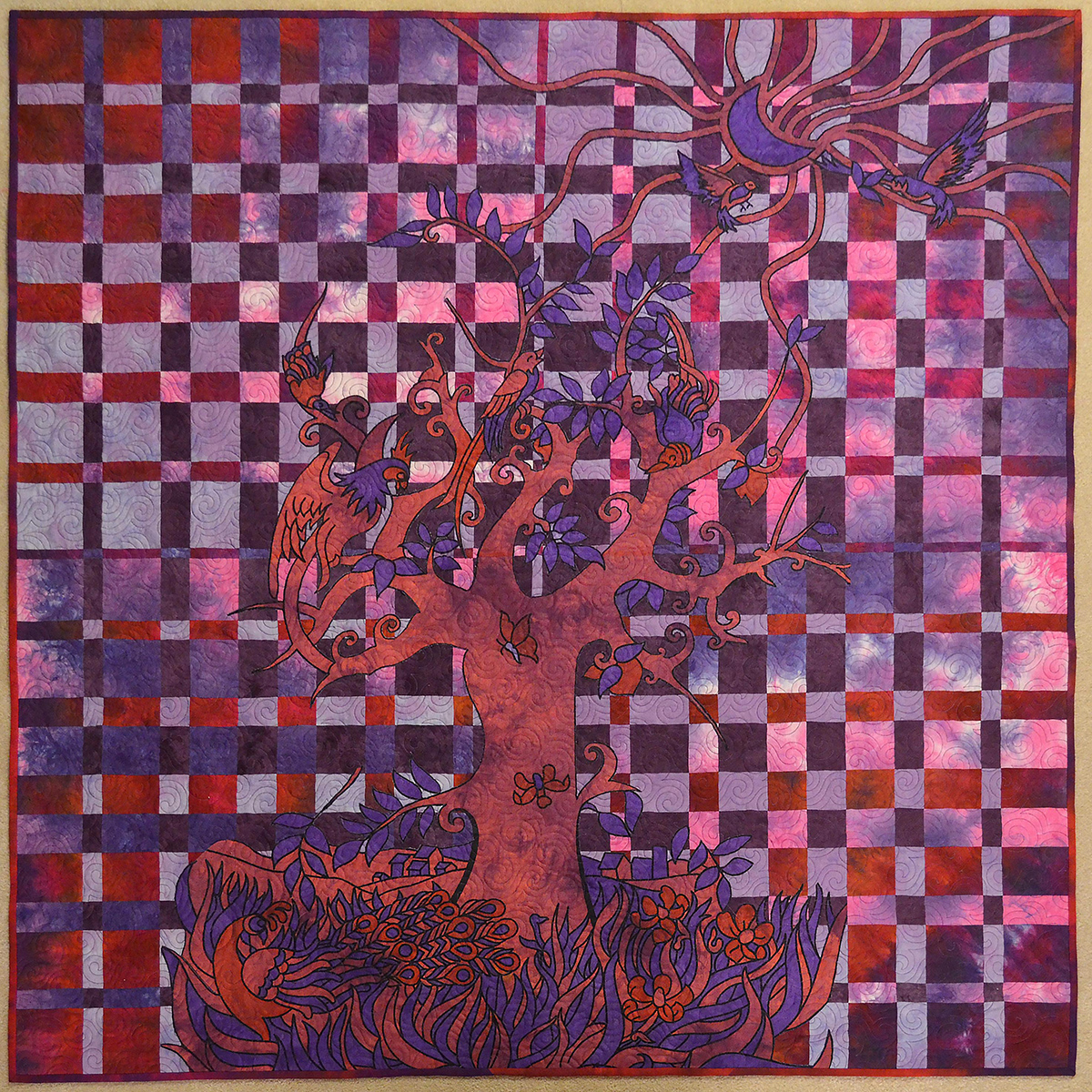 "My Harmonic Convergence is made using the Fire Dragon Challenge fabric. I added 2 other Ricky Tims hand dyed fabrics which complement the Tree of Life batik panel I purchased from Shalawalla Gallery & Gift Shop in La Veta. I fussy cut out the appliques for my Harmonic Convergence from the panel. Four Harmonic Convergence sections were made and joined together. The special message this quilt conveys is all about the cycle of life and the harmony and balance that must be presence in order to have a happy and healthy life. It is quilted with Superior King Tut variegated thread."