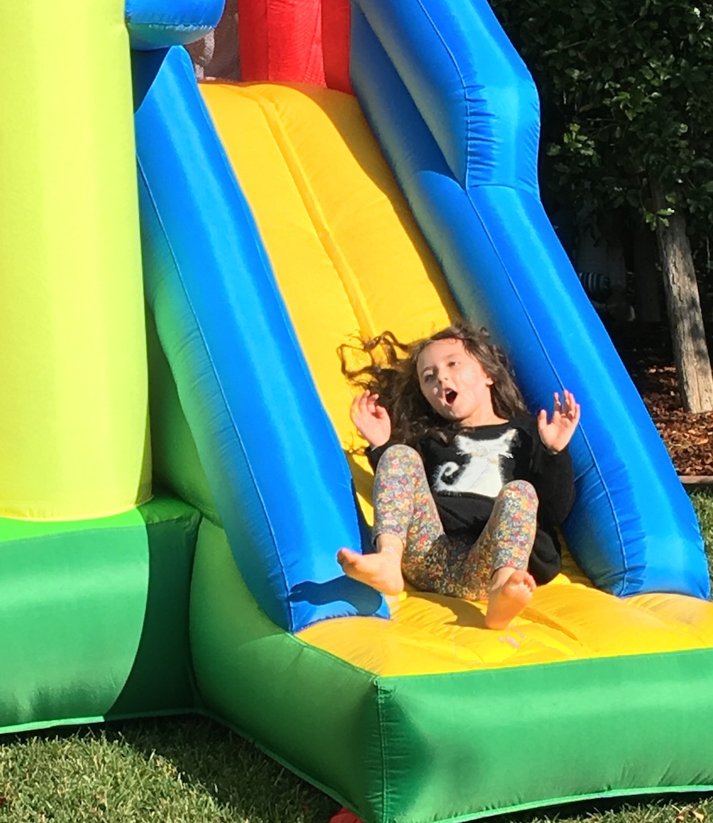 While we were stitching, she noticed that the Jumpy House in the back yard was inflated, so off she went to play; that trumped the sewing machine!