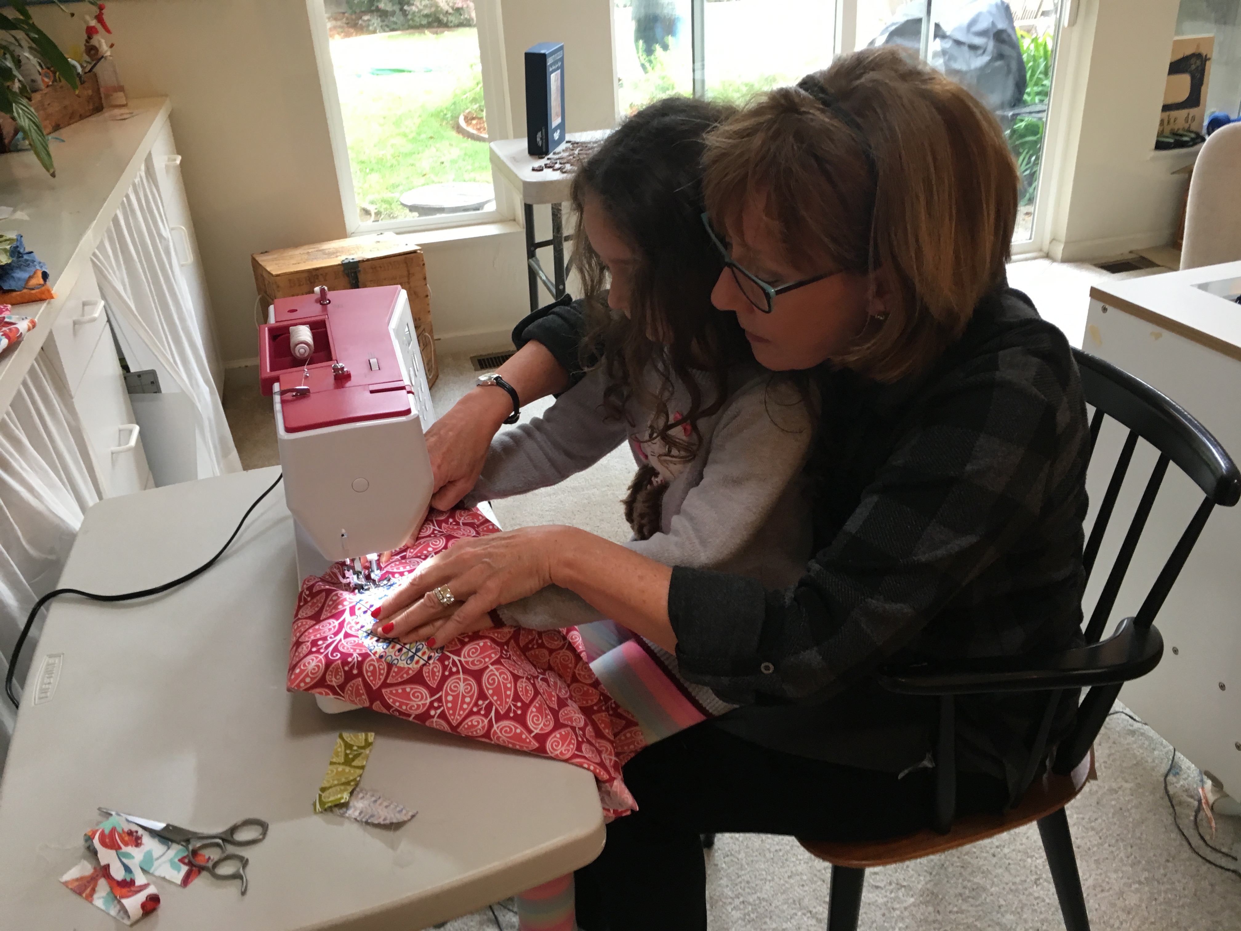 Before we hit the machine with fabric, I had her stitch on binder paper without thread, to practice sewing in a straight line.