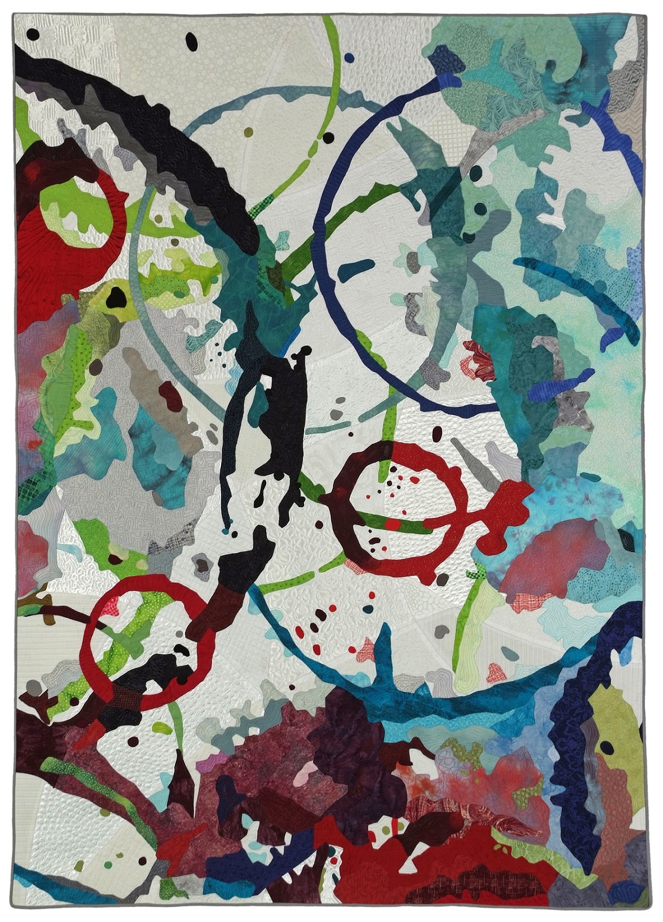 Cosmic Collisions is a part of Katie Pasquini Masopust's Watercolor to Quilt series, where she takes water color paintings that she has made and crops them to find a great composition to make into a quilt. With exquisite threadwork throughout, it is another out-of-this-world quilt from Katie.