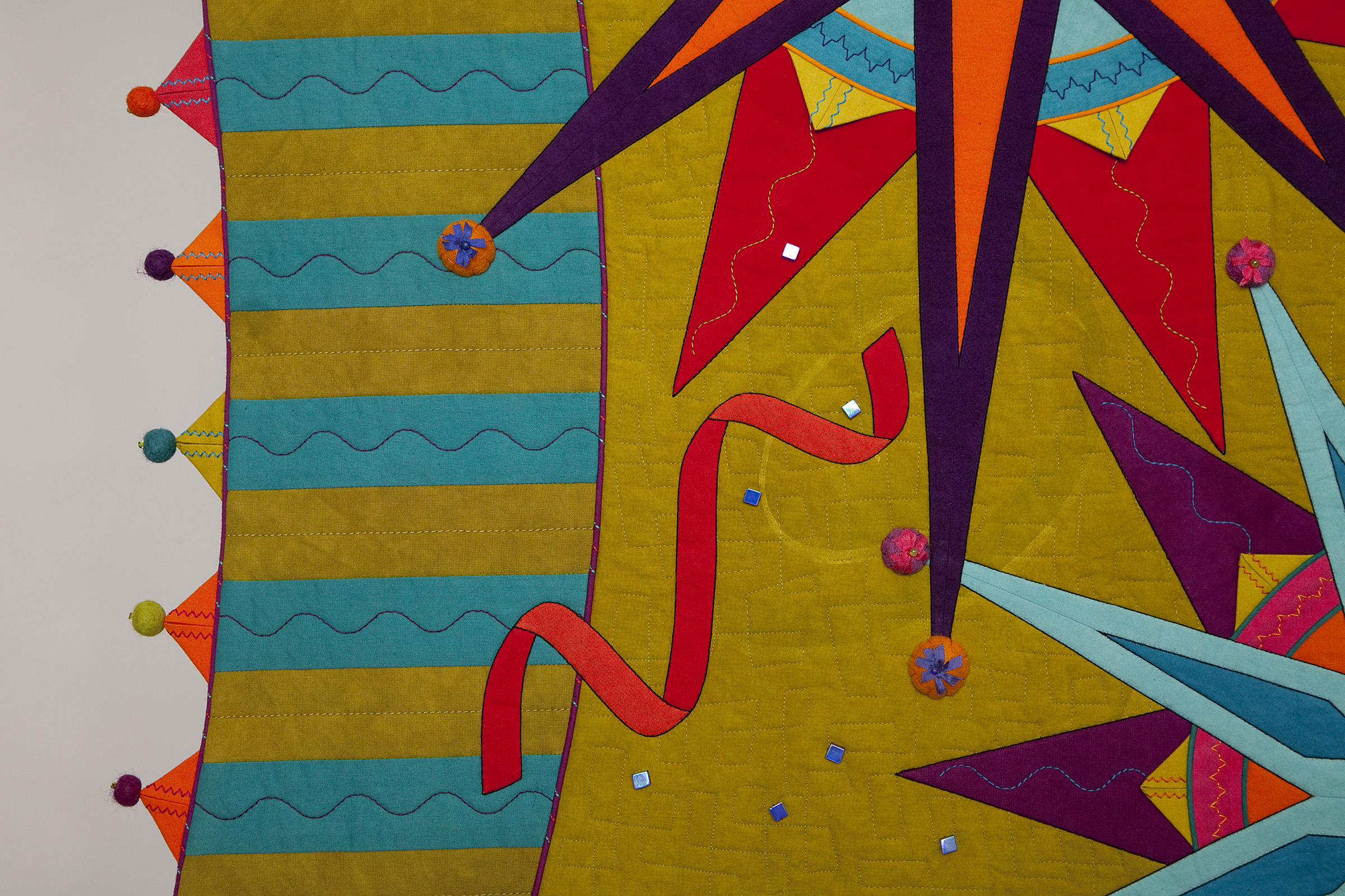 Ah, embellishments! Today there is tremendous variety in threads, ribbons, beads, buttons, and baubles of all sorts. I like mixing smooth, shiny threads with more loosely twisted matte threads for contrast in texture. Felted wool balls are among my favorite embellishments. They can be cut and stitched upon or they can simply dangle from a prairie point.