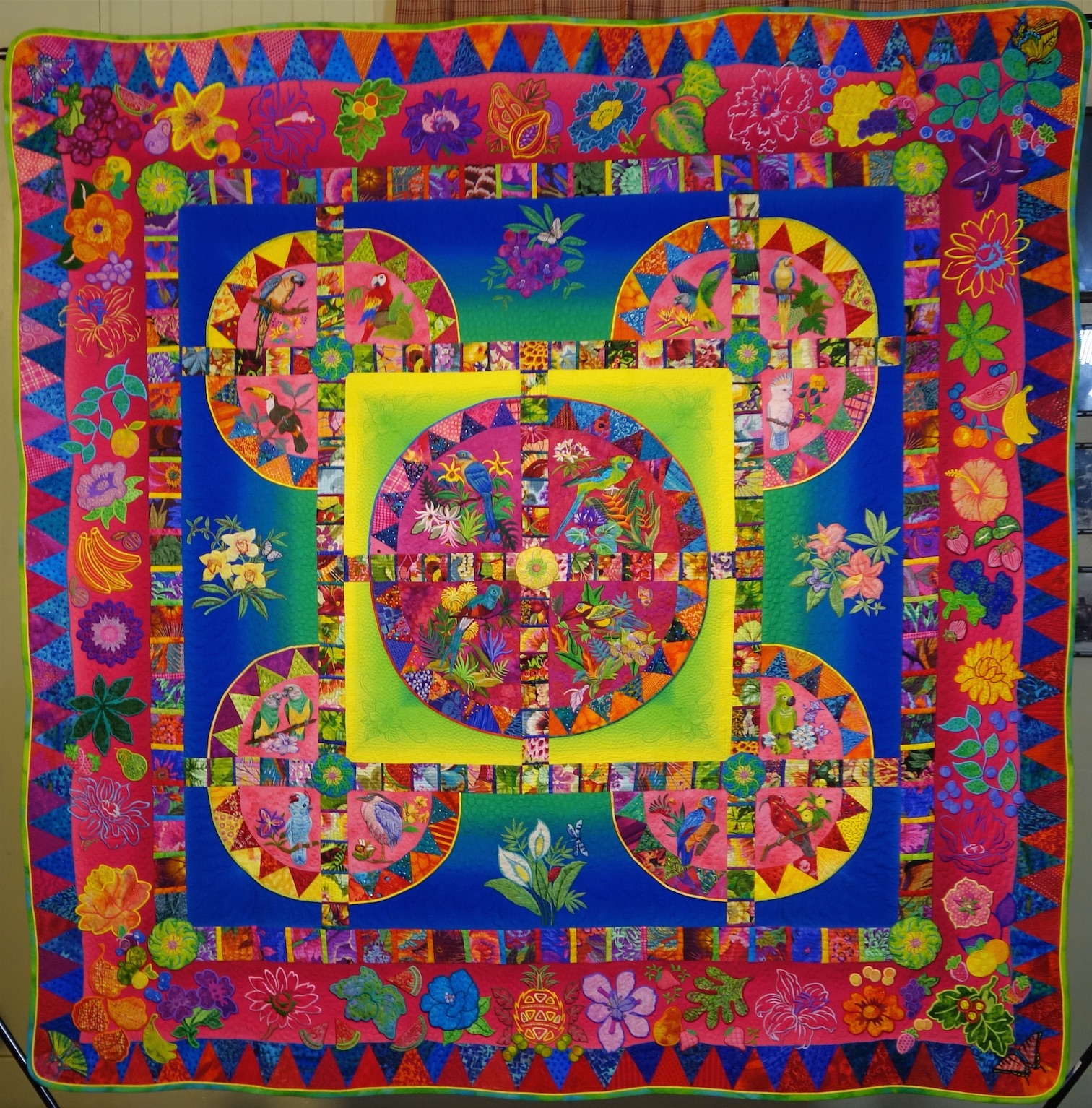 This quilt by Ann Horton will have you experiencing the sites and sounds of the tropics, from the call of wild parrots to the smell of enchanting flowers. Did we mention that the colors are so bright, you might want to wear sunscreen?
