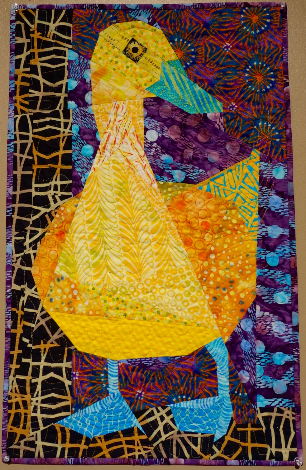 Quack is part of Ann's "Chicken Challenge" series. This is one dashing duck!!! Want to make one yourself, click here for Ann's pattern (finished size 18" x 29"). Using freezer paper templates, this straight line design is easy to sew.