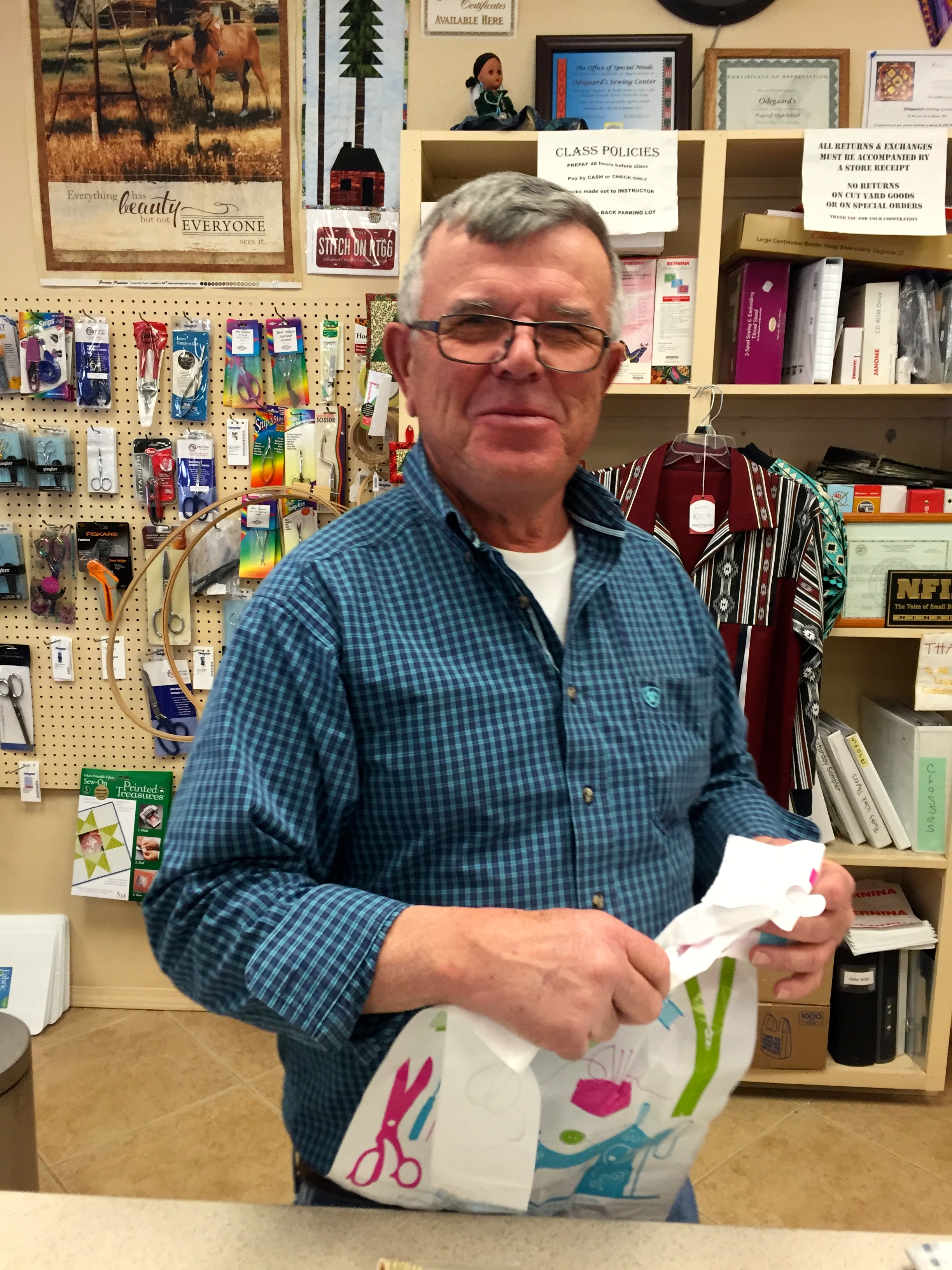 Charlie Odegaard has been the most recent generation helping quilters/stitchers in the pursuit of their craft and art. The shop was opened by his grandparents in 1970 and continues to be a place for those who need a sewing machine or something to sew in Northern Arizona...or, for those traveling through. It is huge and offers a wide variety. The Independent Quilt Shop, which we promote through the Quilt Roadies, has added another shop to the list of must visits. You will not only have a wonderful shopping experience but Charlie...well, he treats you like a long lost friend. You need something, he is going to hunt around the shop himself to find it for you. Which brings me to the chair. I wrote about my sewing chair a few months ago...how incredibly comfortable it was to sew for hours. Hitting your back in just the right place, keeping your legs in just the right flex. So much so that gals in my sewing group each have one. Remember these...not very attractive, but if it will keep me sewing for a few hours pain free it is worth every penny!
