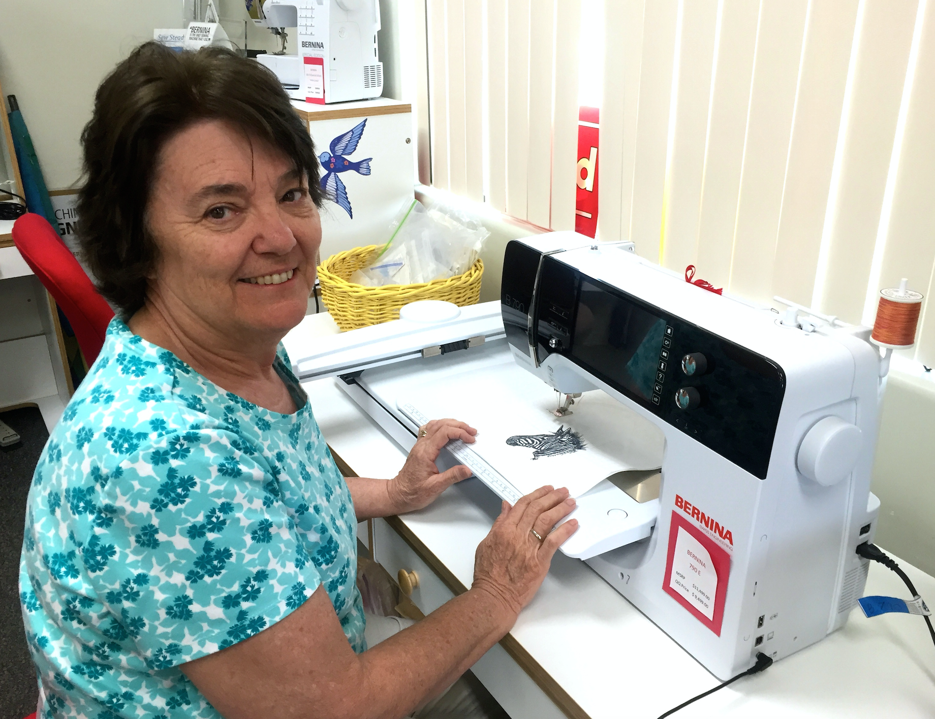 The instructor was Georgia Mate who is the BERNINA expert in the area. She has been teaching owners of a BERNINA the ins and outs of their machine for 28 years! She actually bought a BERNINA store before she even owned a BERNINA. LOL. Now that she no longer owns a shop, she travels to three different shops in Arizona in support of BERNINA sewers. She has also designed many patterns to be used with embroidery machines. And, she herself owns 15 BERNINA machines!!! I think next time we are in the area we need to do a sewing room tour!!! What do you think?!
