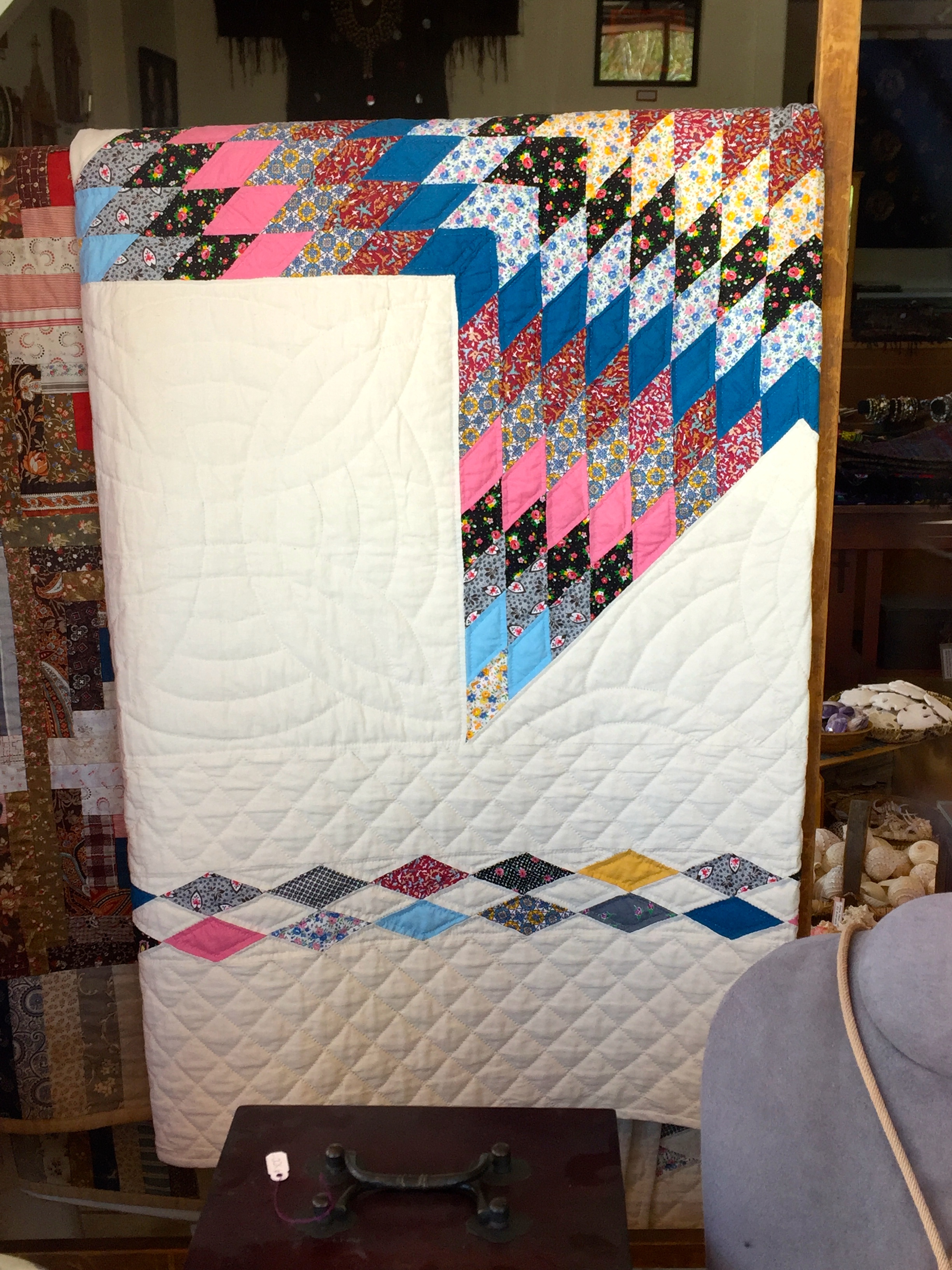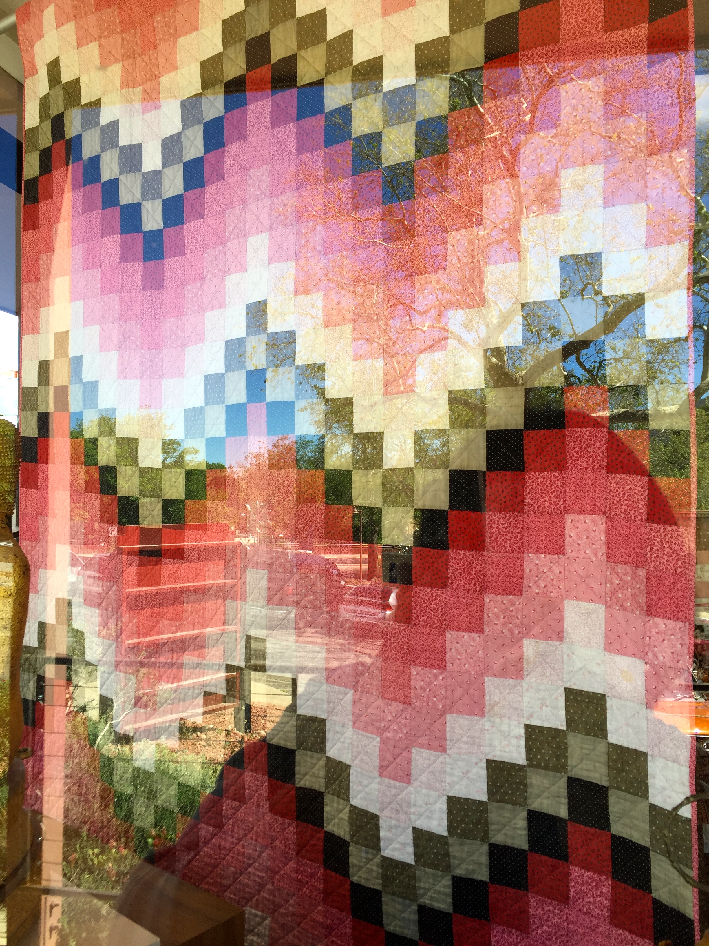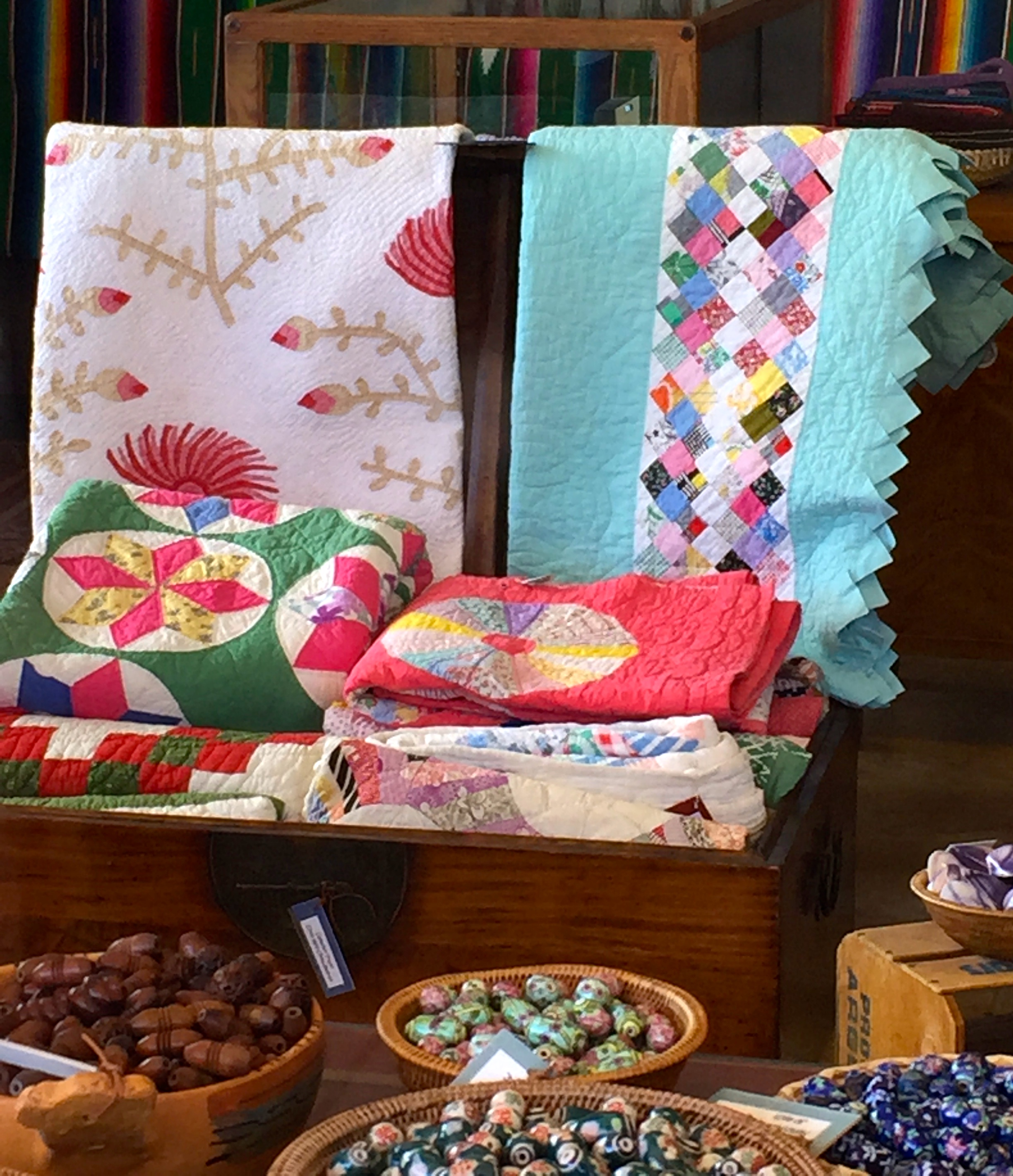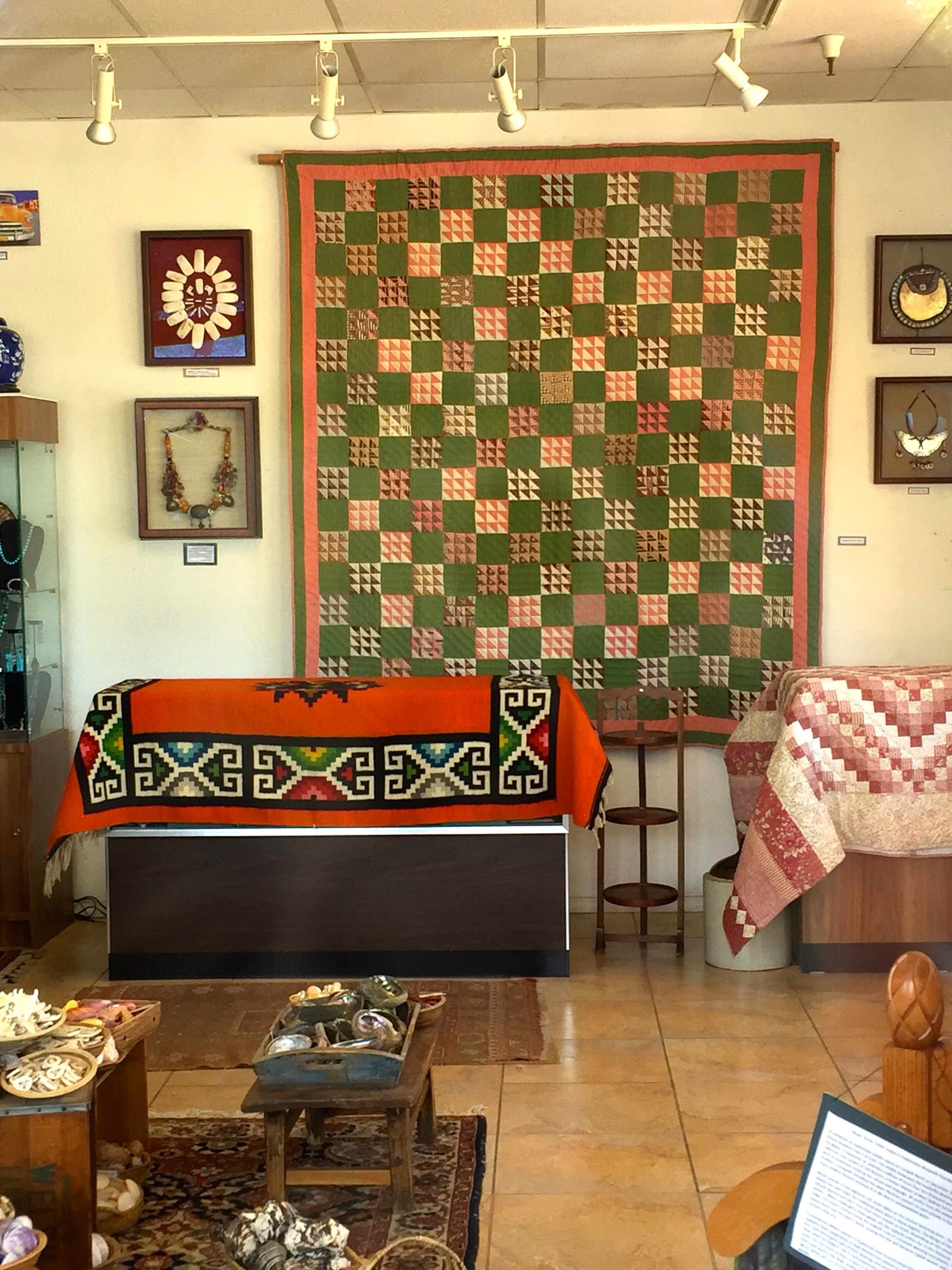 When we settled down in Sedona for a few days,I made my way over to a shop that carries collectibles. I think quilters are inherently collectors, and a shop filled with "collectibles" seemed a great way to pass a few hours. Unfortunately, it was closed and had a hand written note on the door that they were sorry but had to close at 1:00. Boo Hoo!!! That didn't stop me fromleaving my nose print on the window as I stretched to look at the quilts that werehanging or lying around and taking photos. I loved all of them.