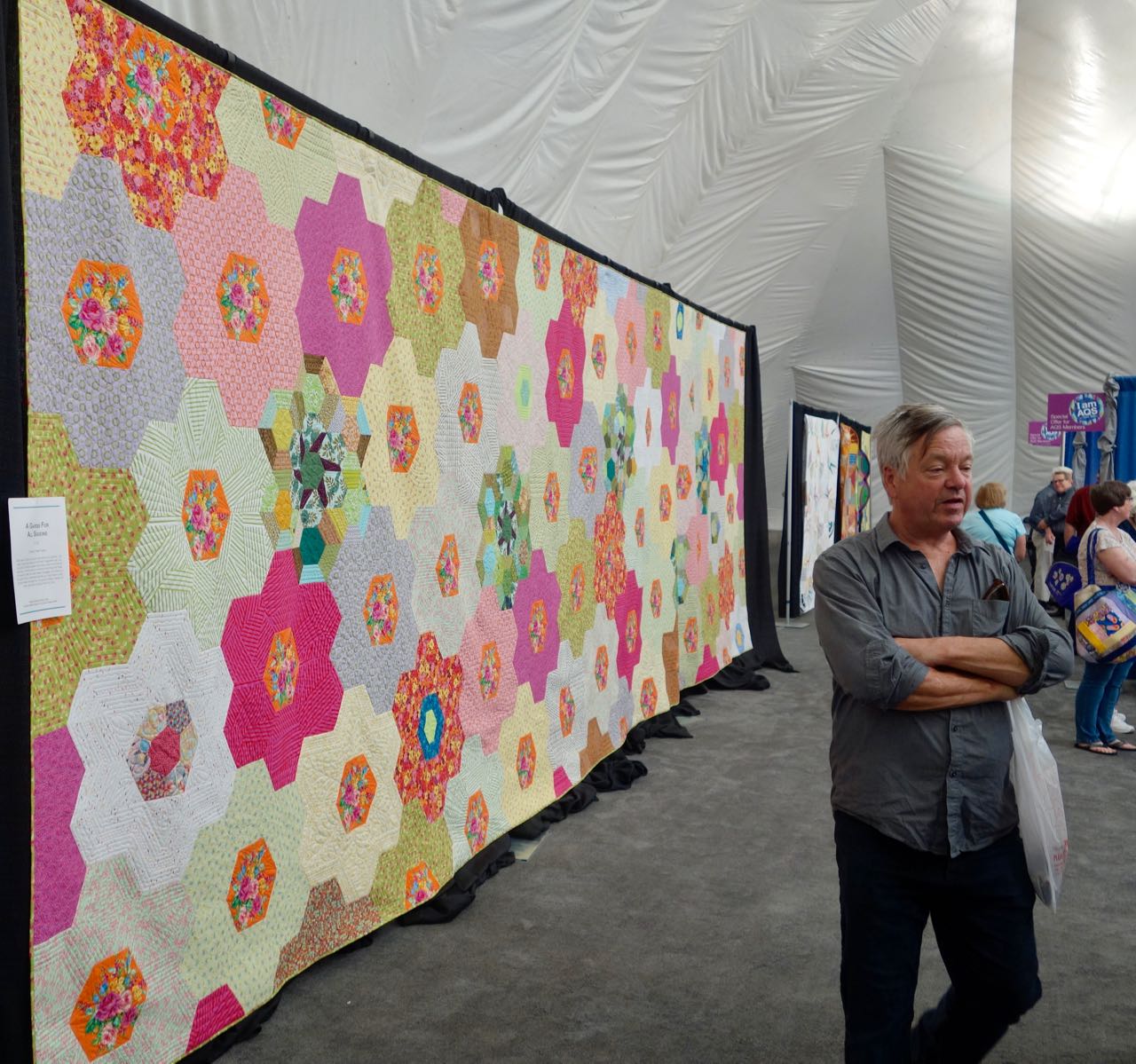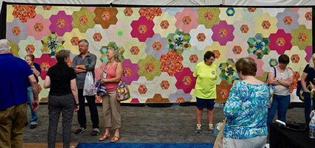 Take a walk with Victoria Findlay Wolfe through her exhibit, Double Wedding Ring Quilts: Traditions Made Modern, at AQS QuiltWeek –Spring Paducah 2017. You will also get to see the 9 ft. x 30 ft. hexagon quilt she made. What does one do with a quilt that large? – hang it on a wall in a business with a 40 ft. wall, of course.