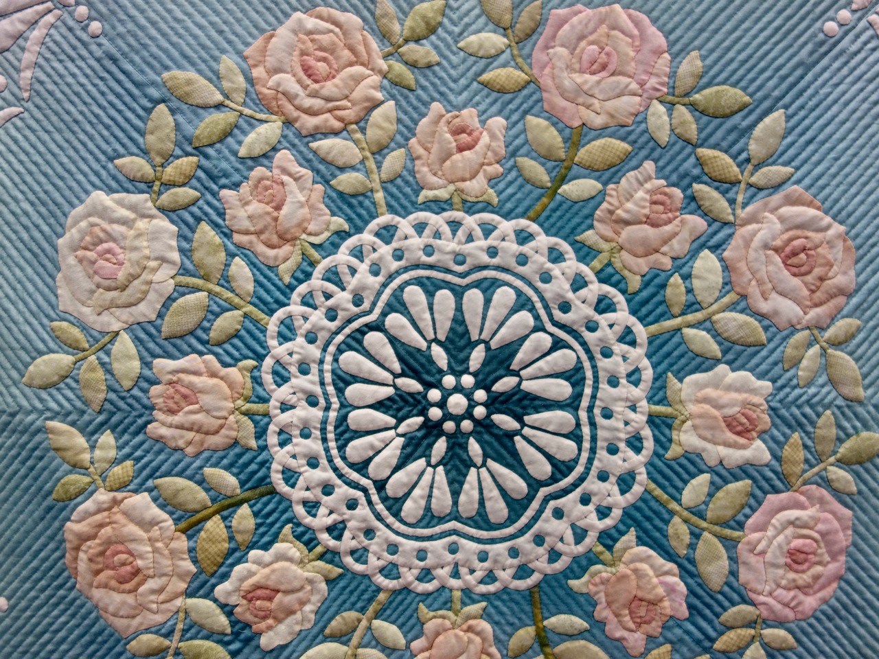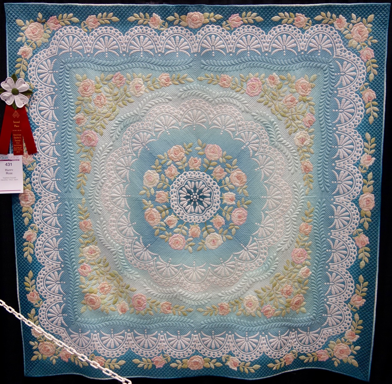 Yoshimi Suzuki created the award-winning quilt "Happy Rose," 82" x 82", using hand appliqué, trapunto, and hand quilting. The quilt was awarded 2nd place in the Hand Quilting category at Paducah 2017. The color mix in the flowers, the lattice work that makes it all look like a dream, and the hand quilting is beautifully done. BUT it only took second. 1st Place will be shown on Sunday.