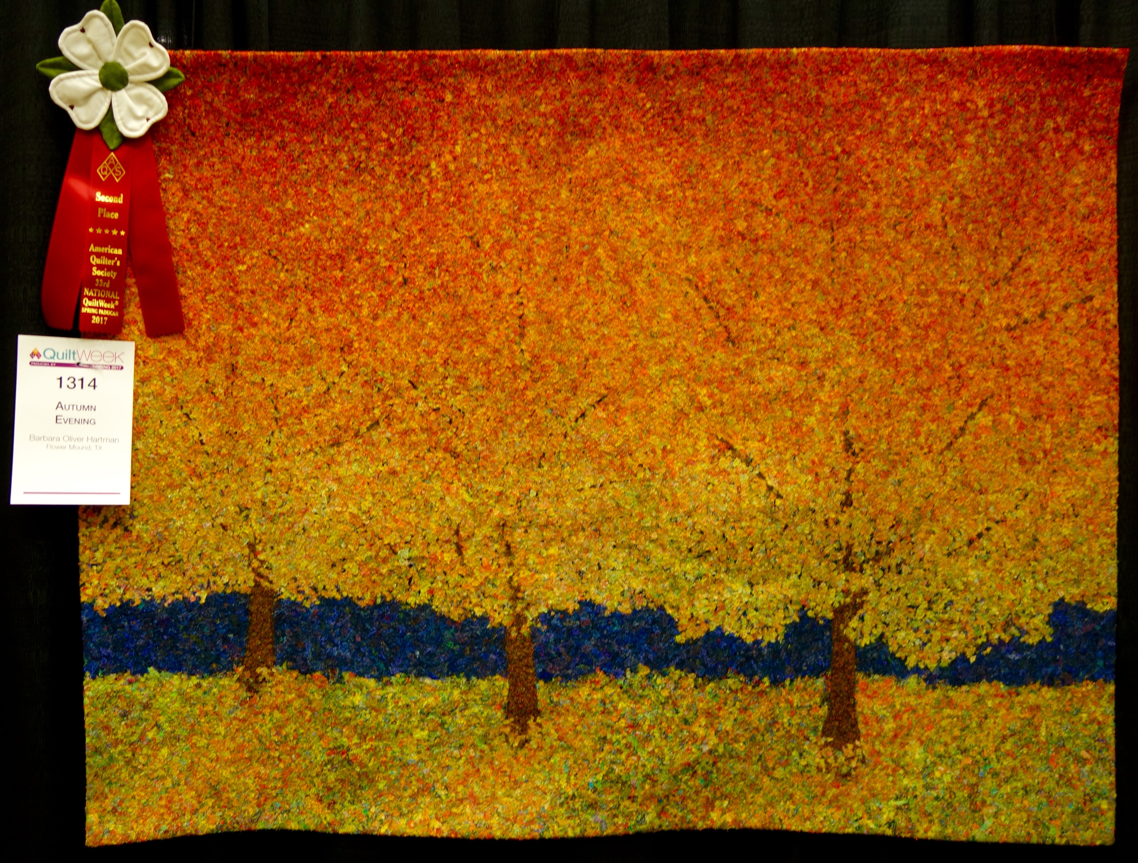 "Autumn Evening" (54"x41") by Barbara Oliver Hartman won 2nd Place Small Wall Quilts Pictorial at AQS QuiltWeek Paducah 2017. The quilt is quite striking, but we spent most of our time trying to figure out how it was made. Do you have any ideas?