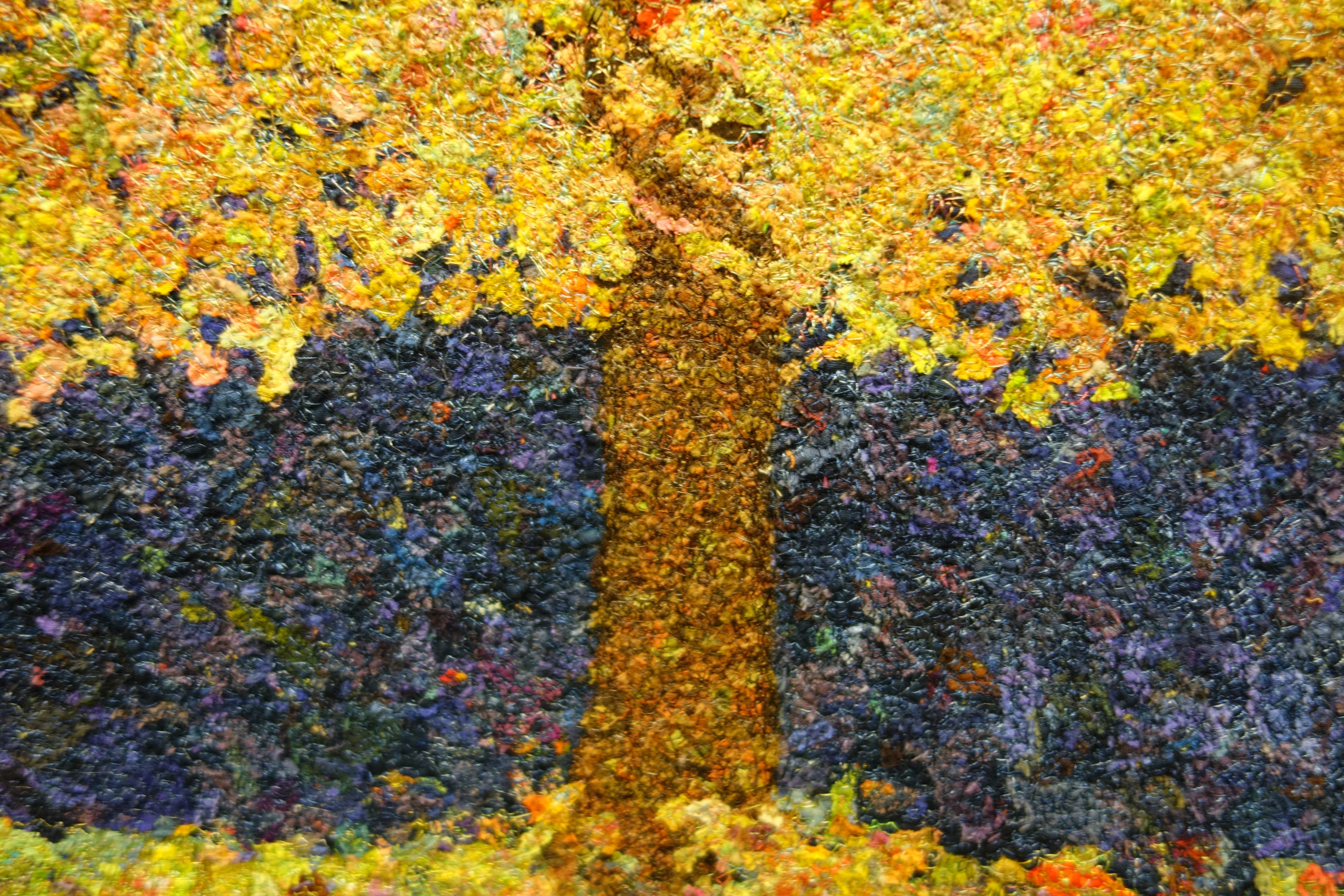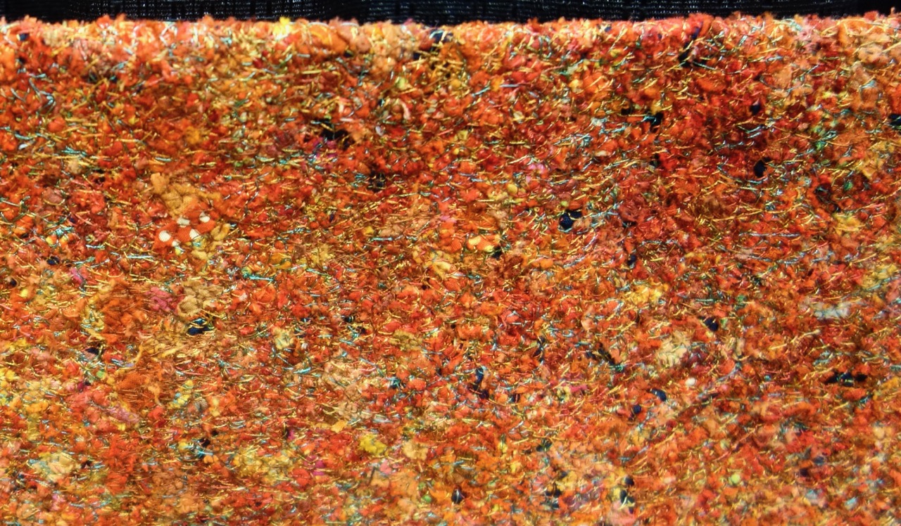 This quilt was made from small pieces fabrics left over from previous projects and then sorted by color and then cut with rotary cutter and scissors into very small pieces. It is then sewed to a background using a free motion zig zag stitch. No netting or fusing is involved. The process is very time consuming but addicting.