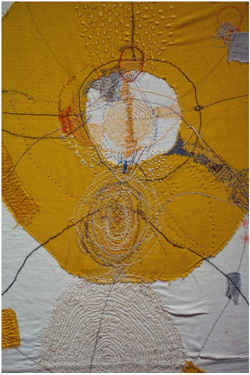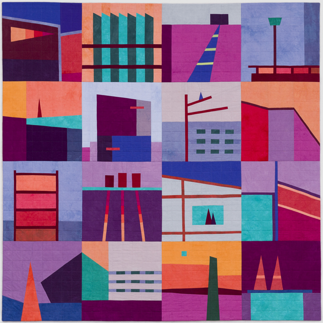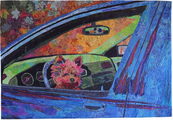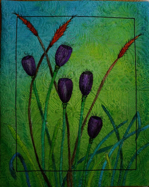 This quilt is a raw edge fused creation using my hand dyed cotton and silk fabrics and fusible web to create it in what I refer to as a collage technique. I finished the quilt using a pillow case technique to complete this small 8” x 14” quilt. A stitch in the ditch around all of the design motifs in rayon thread completed the composition nicely.
