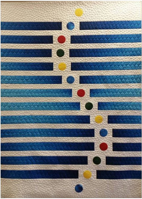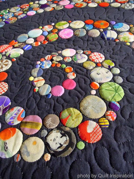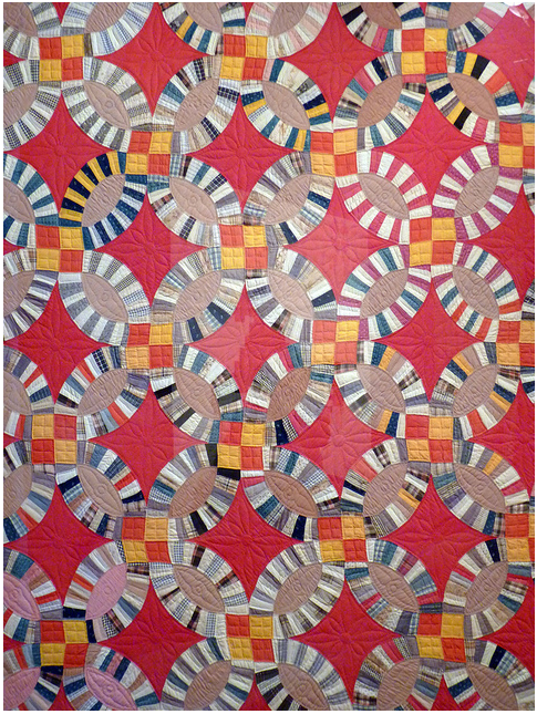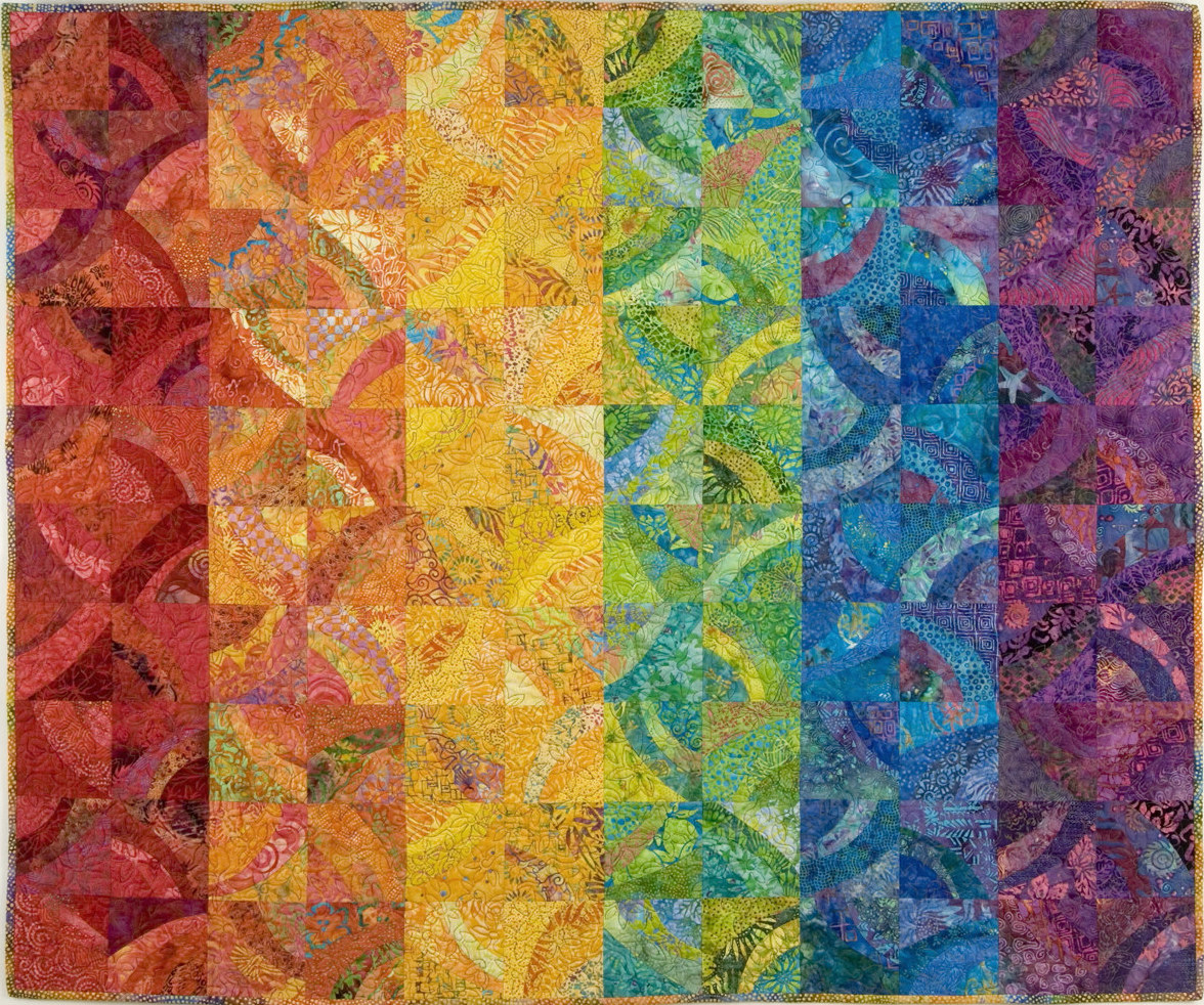 Another way to have everyone in the cast get along, is to include multi-colored fabrics that feature all three of your selected colors. Notice Taeko Iwashita's stunning use of multi print fabric to keep the viewers attention and interest in her Double Wedding Ring quilt Forever. Yellow is the obvious star, while blue and red play the supporting roles. But, other members of the cast are prints that include a blend of all three colors.