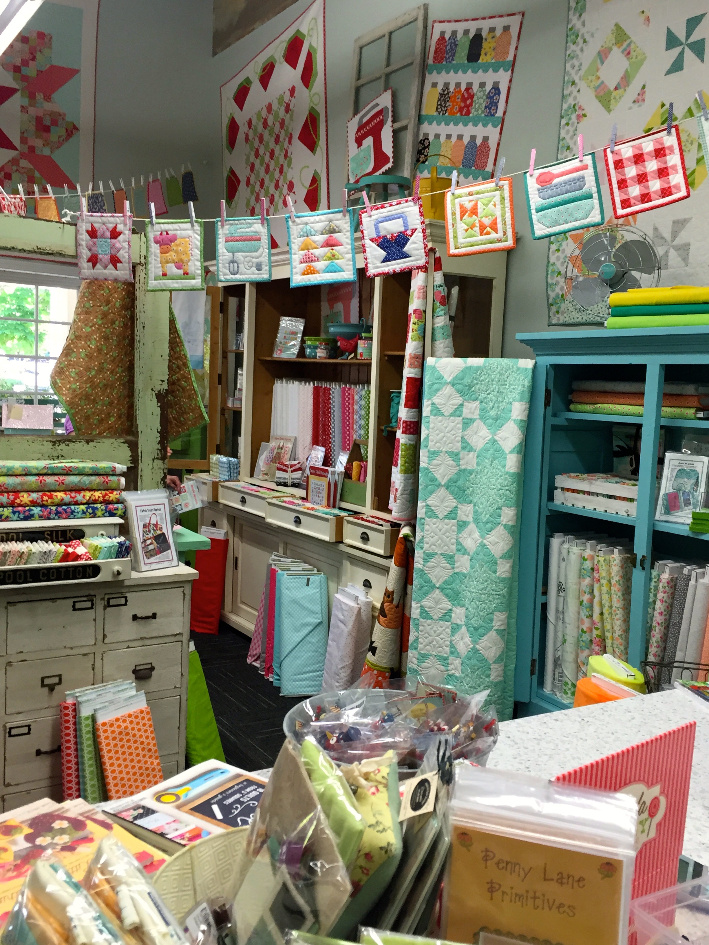 Christine Schultz & Jan Hill have been in non-stop mode, along with Brian and the gang, to get the shop in tip top shape for the Grand Opening on June 24th!!! As you can see they are off to a fantastic start! Thank you to ali ndependent shop owners for giving us a place to pet the fabric :)
