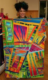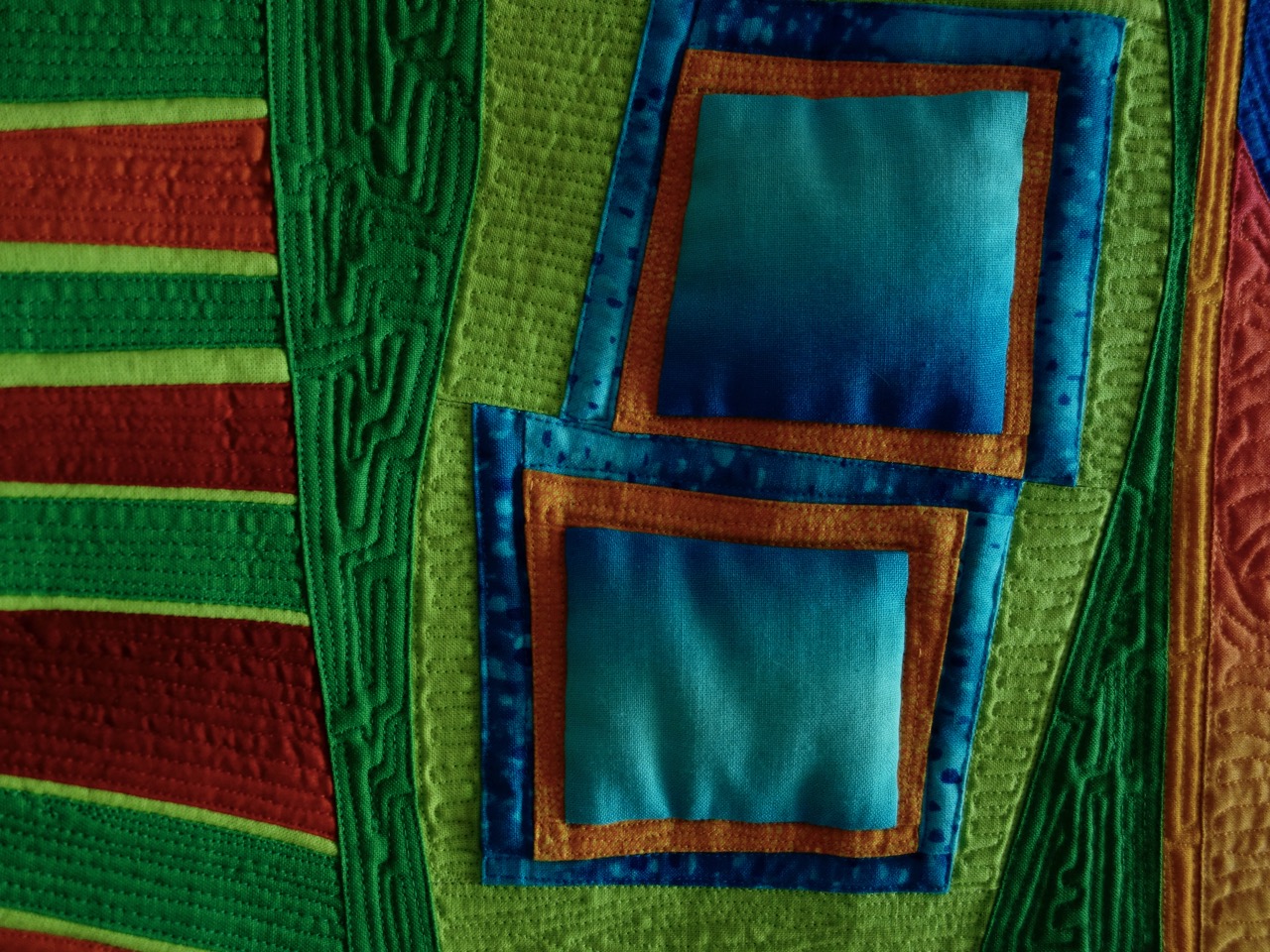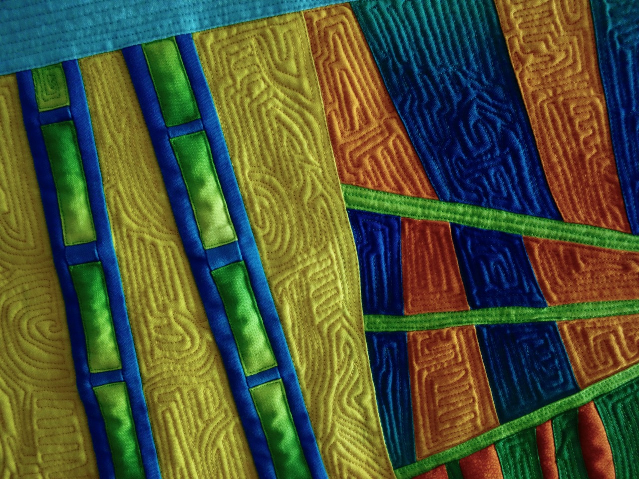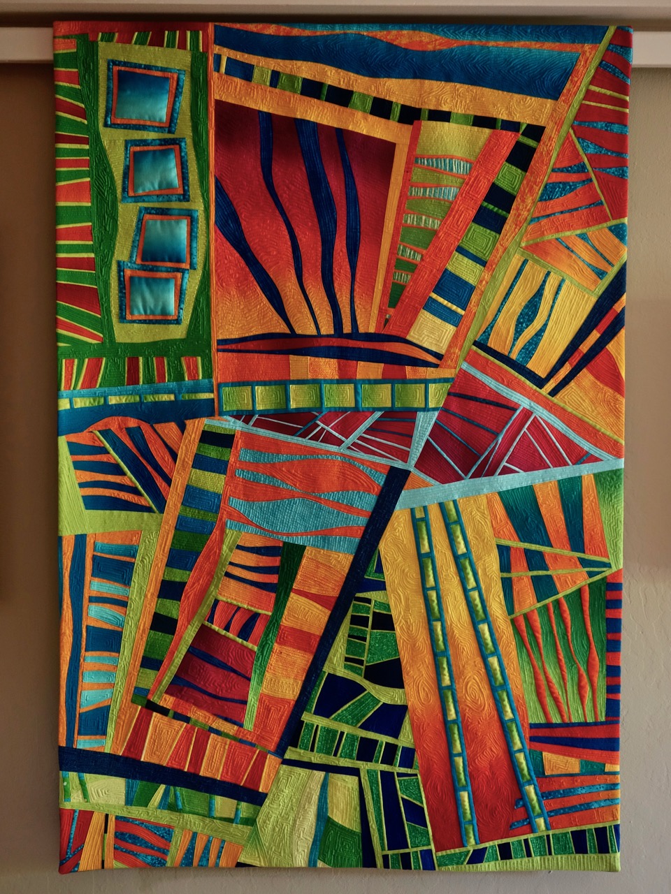 Sheila Frampton Cooper had just started quilting less than 2 years before she made this quilt. It was in a special exhibit juried by Ricky Tims and was placed right across from the TQS booth at Road to California. Alex knew Sheila as Zoombaby on our site and loved her and her work. The quilt, Sunset Cinema, came home after the show was over.