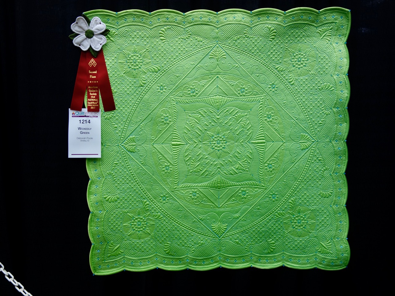 Actually the full category is Small Wall Quilts - Movable Machine Quilted and Deborah Poole of Shelley, Idaho won the 2nd place prize. Her 47" x 47" quilt "Wickedly Green," has beading, crystals, embellishments, free-motion quilting and matchstick quilting.