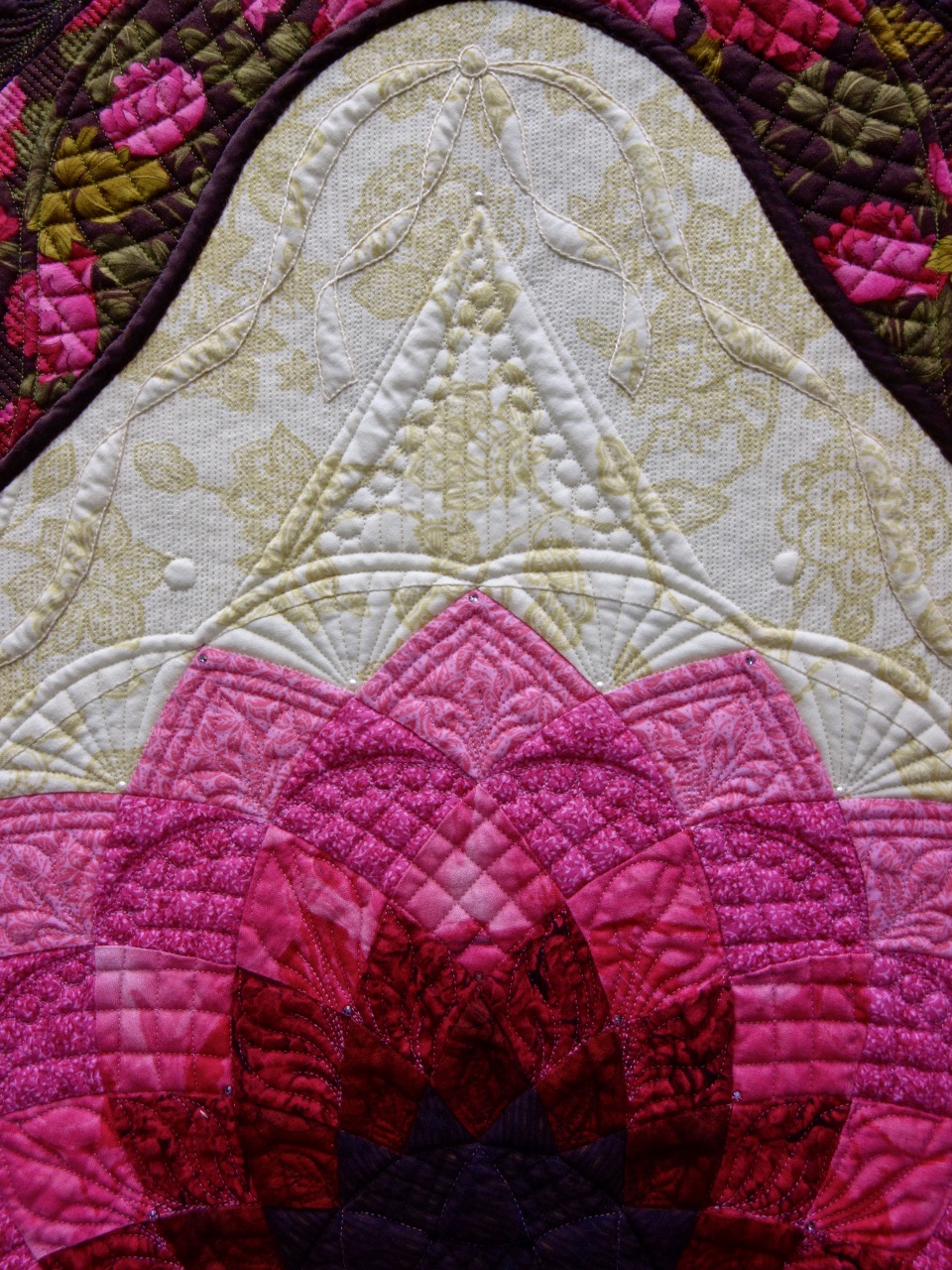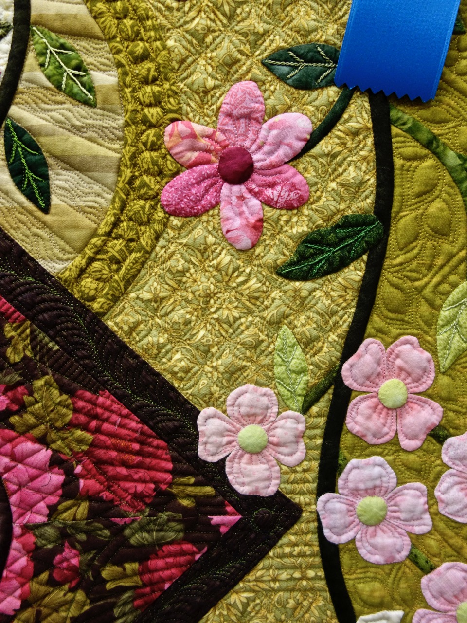 Congratulations to Margaret Solomon Gunn of Gorman, Maine, for her 1st Place Quilt Springtime in the Geisha's Garden. This 59" x 60" quilt was created with hand appliqué, bias work, crystals, free-motion quilting, matchstick quilting, paper piecing, and piped edging. (Whew!?) It is a lot of work just to type all those techniques much less to have put them all in a quilt.
