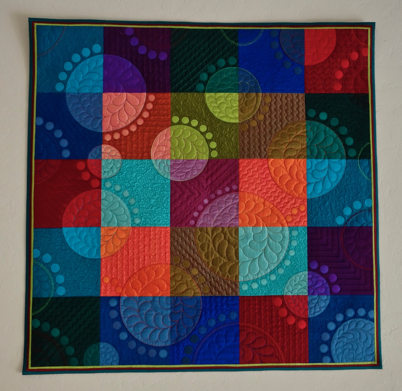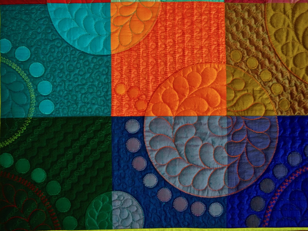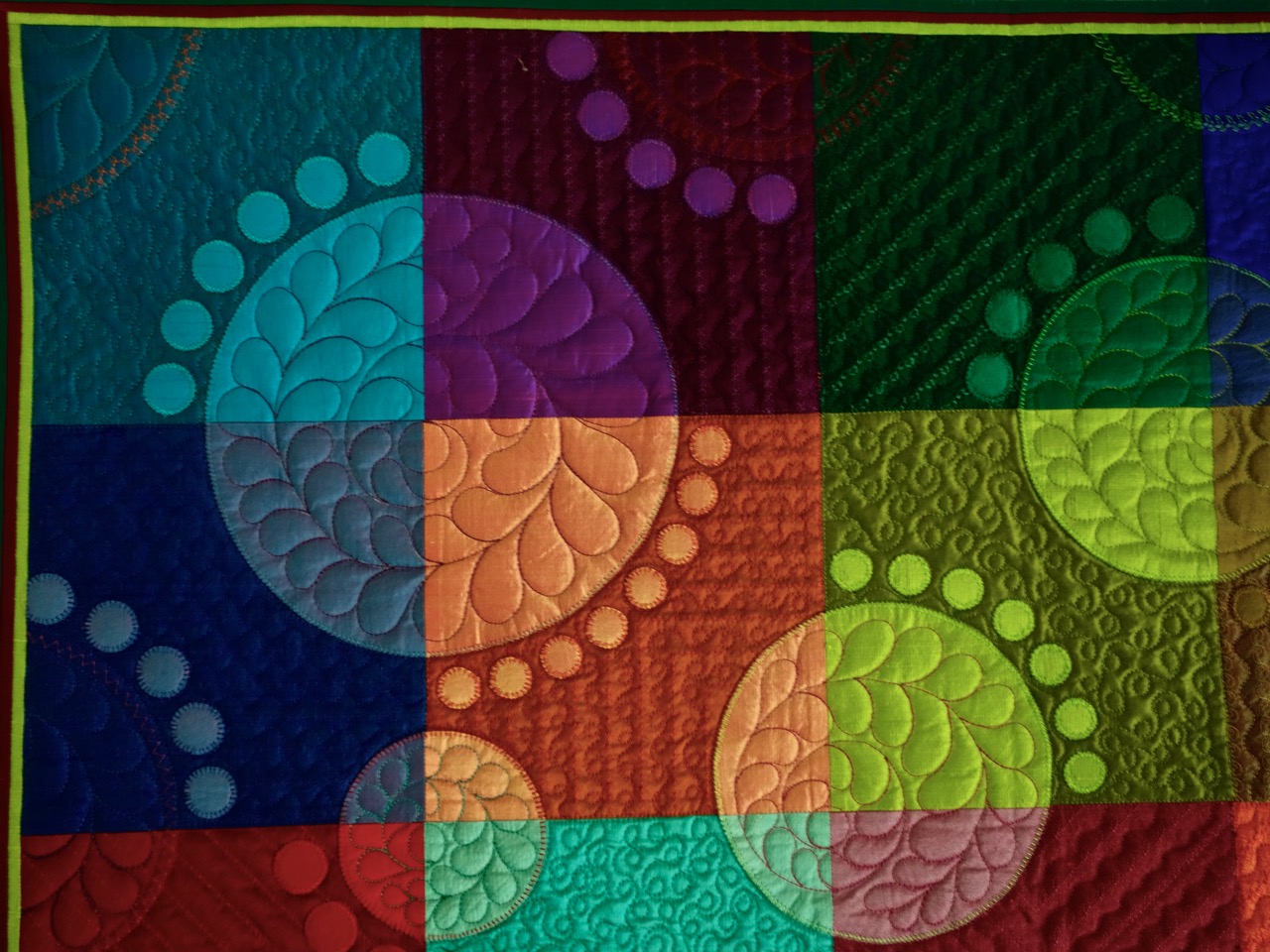 Wouldn't you love a quilt by Sue Nickels and Pat Holly? It would have great color, design, and quilting. Sue and Pat made "Lovely Libby Circles," a 30" x 30" quilt that was inspired by Libby's Quilt "Circle the Date" (2008). It was for an auction to benefit Libby's medical expenses. Alex had to have it (it was on auction for about half a day and then Alex said "Forget this!" and the auctioning was over). There are different quilting approaches and stitches all over the quilt (just like Libby would do). Some of the blocks were dark and hard to show, but you will love what you can see.