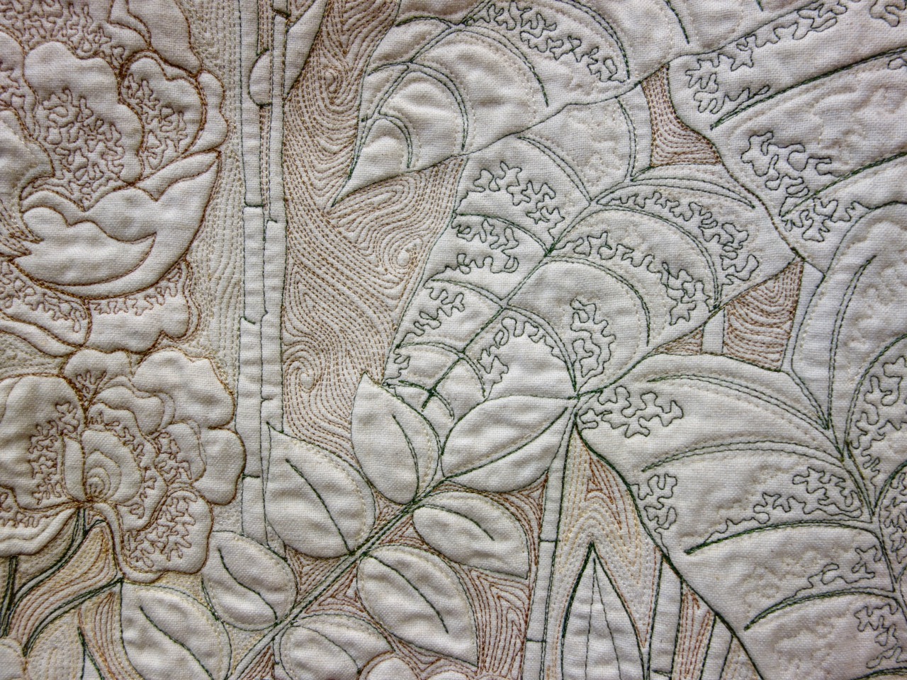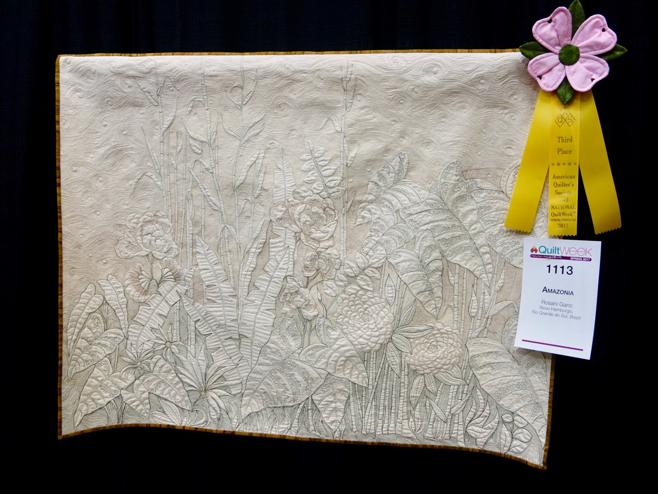 Rosani Ganc is from Novo Hamburgo, Rio Grande do Sul, Brazil. She created Amazonia, a 42" x 32" quilt that took 3rd Place in the Small Wall Quilts-Stationary Machine Quilted category at Paducah 2017. She free-motion quilted this quilt and used several thread colors. Congratulations to Rosani.