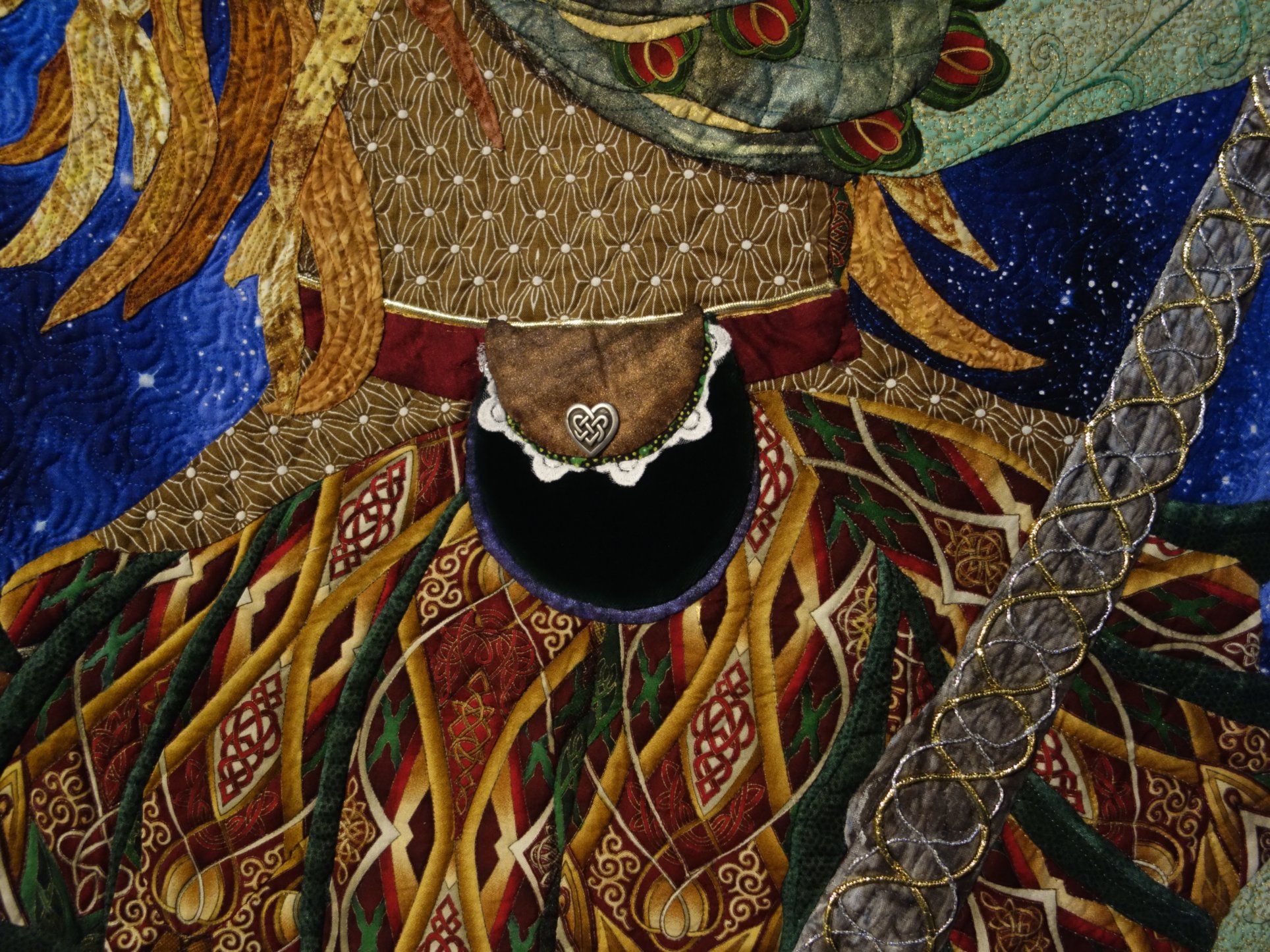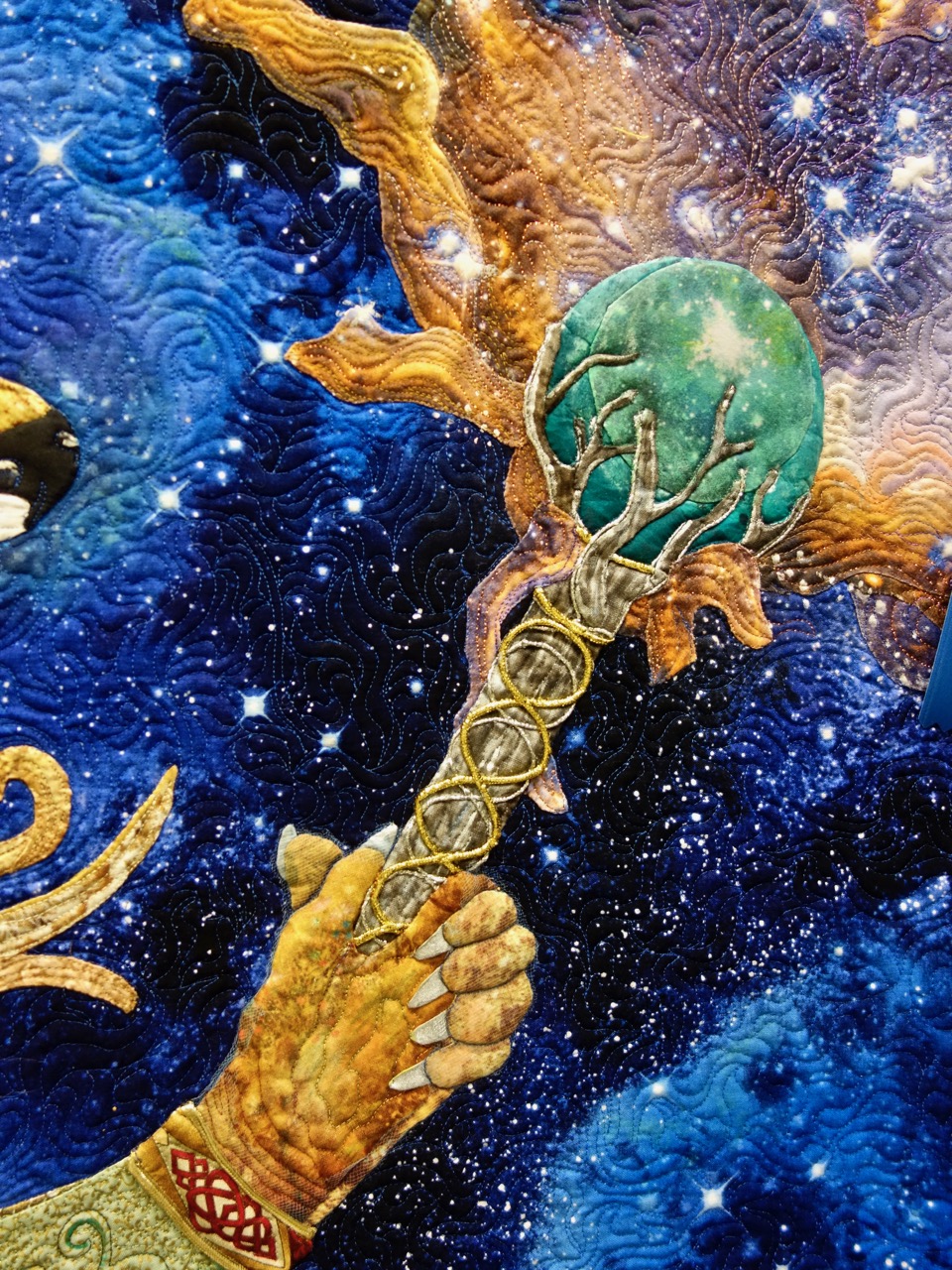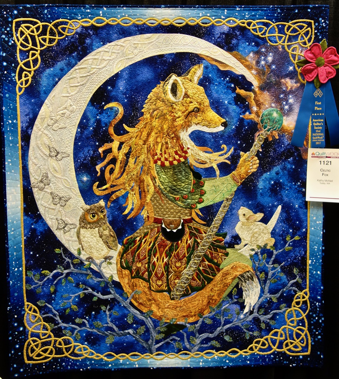 We are Kathy McNeil fans and apparently so are the judges at Paducah 2017, where she won two 1st Place prizes. Celtic Fox, a 51" x 57" quilt, won 1st Place Small Wall Quilts - Stationary Machine Quilted. Kathy used hand appliqué, bias work, embellishments, free-motion quilting, interfacing, and fabric painting to complete this intricate marvel.