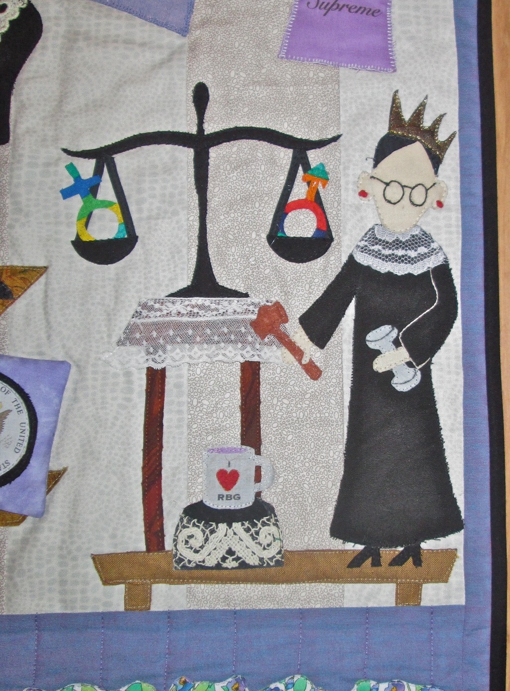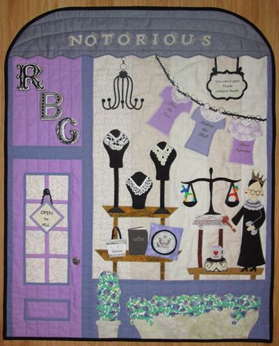 In case you can't read what's one the quilt, the shirts say "Love the Lace", "Follow the Frill" and "Diva Supreme". The hanging sign says "You can't spell Truth without Ruth." The tote bag says "I Dissent."