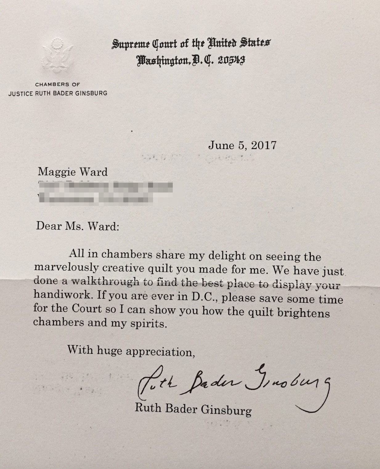 How cool is this? Maggie Ward created a quilt featuring Ruth Bader Ginsburg and sent it to her. To her surprise, she received a lovely response and very special invitation.