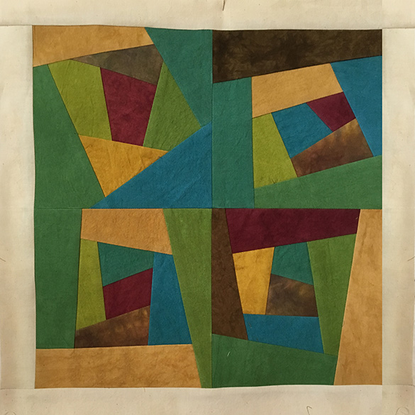 Here is the Crazy Patch block in the four Blendables colorways. Each Blendables pack has six hand-dyed fat quarters. Each colorway is comprised of two coordinating Blendables packs (twelve fat quaters total) and a coordinating one-yard piece of background fabric.