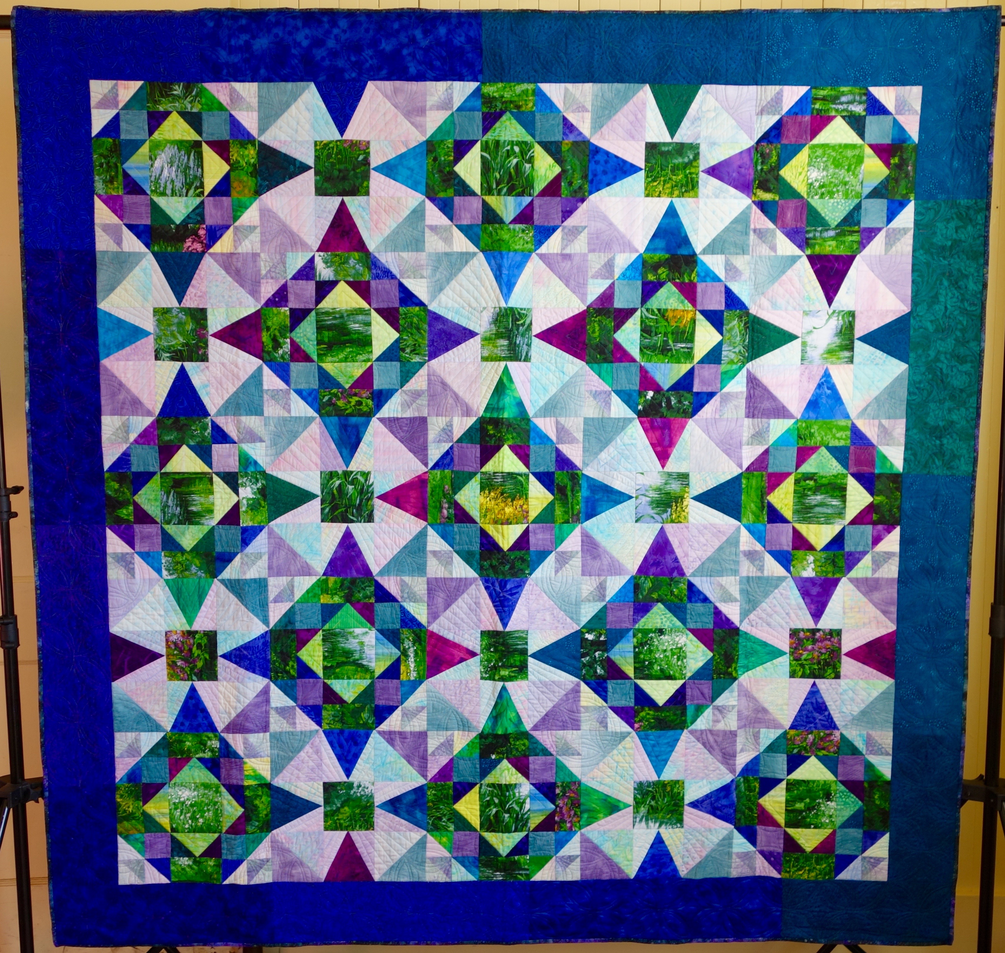 "Memories of Monet combines two traditional blocks that I could use to create four-pointed stars, diagonal lattices, and illusionary circles. The fabric combination was inspired by a Monet garden fabric that was featured in each star block; hence the name."