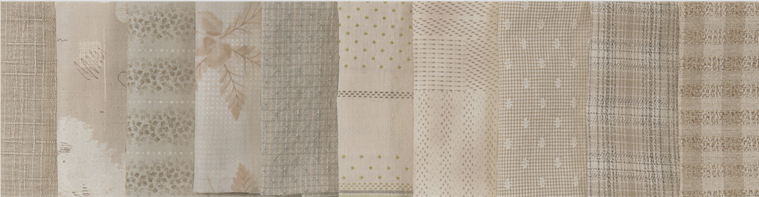 At first glance the grouping may seem to just be shades of brown, but, step in as we take a closer look at the small fabric stack to the right. The fabrics are actually a tone of red-violet. Thirty years ago, Japanese quilt artist Yoko Saito, visited the US and was fascinated by the slightly faded or washed out look of American antique quilts. Wanting to recreate this softer 'antique look' in quilts, Yoko began to design fabrics to replicate this look. In her book Japanese Taupe Color Theory: A Study Guide she suggests that one should compare the fabric colors to foods that we know.