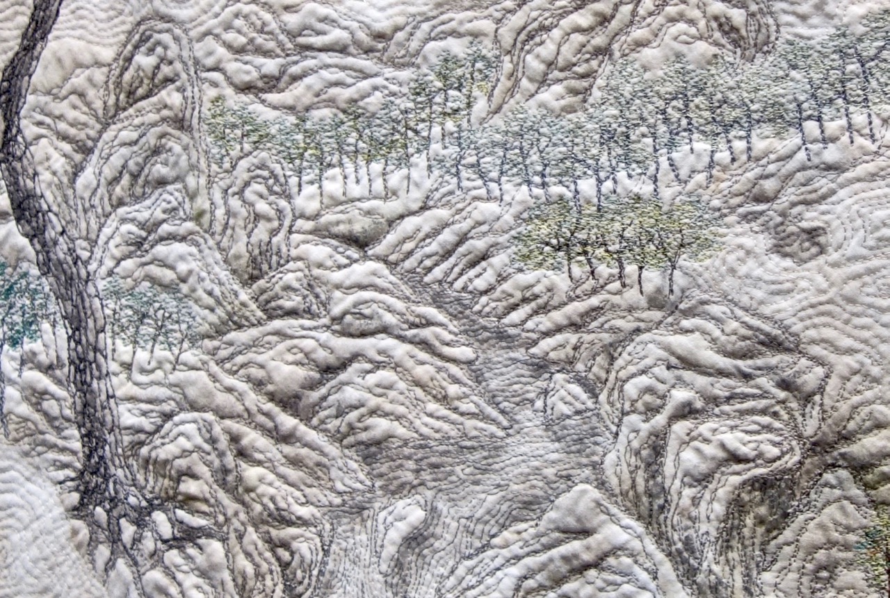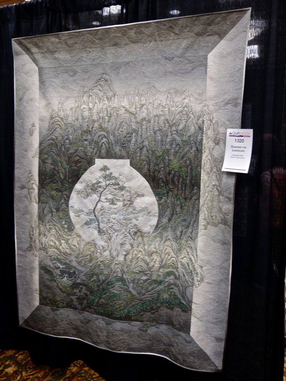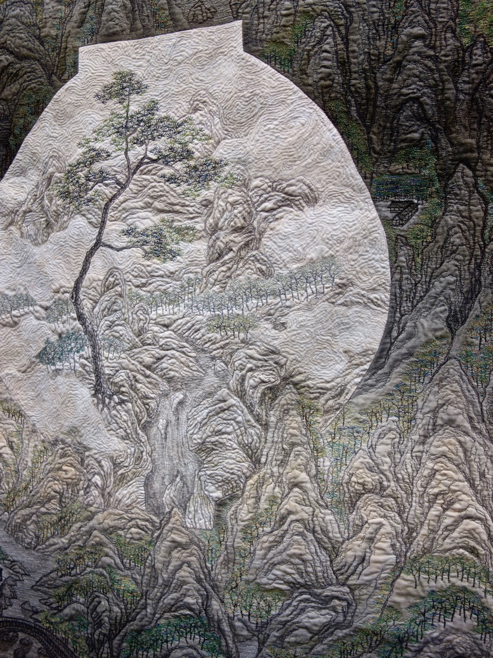 Hyesook Kim of Busan South Korea created the quilt Enshrine the Landscape, 59" x 79", using Hand Appliqué, Hand Dyeing, Free-Motion Quilting, Fabric Painting, Shiva Paintstiks, and Thread Sketching. Her quilt was accepted in the Small Wall Quilts - Pictorial at Paducah 2017. There is a lot going on deep in the design. Take a look.