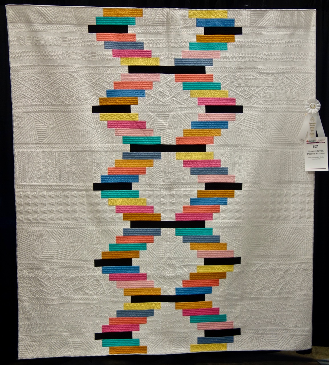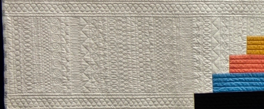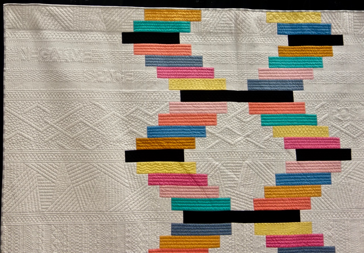 Victoria Findlay Wolfe had a huge showing at Paducah 2017. She won several honors and had a special exhibit of Double Wedding Ring Quilts. (Click here to see the special exhibit). In the Wall Quilts - Modern Category, she won an Honorable Mention Award for "Negative Space, Positive Attitude." It's a master class in quilting. Do you need some great quilting design ideas? Just look at this quilt and make a choice.