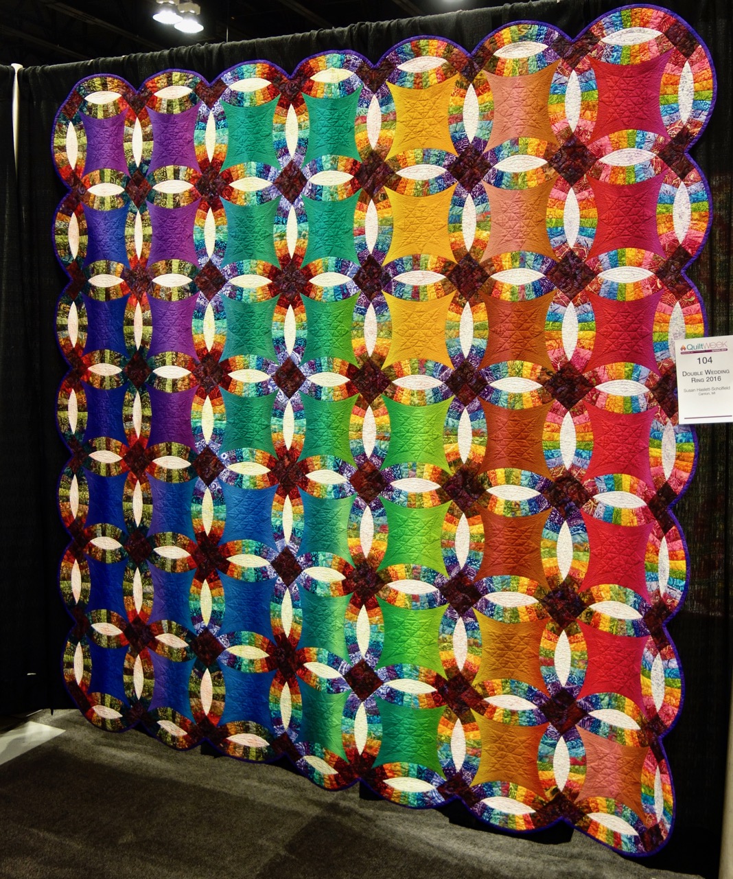 Susan Haslett-Scholfied of Canton, Michigan, USA displayed her quilt, Double Wedding Ring 2016 (88" x 88"), in the Large Quilts - Stationary Machine Quilted category at Paducah 2017. It is a beautiful study in color that is more complicated than we originally noticed. (Her color wheel must still be smoking.)